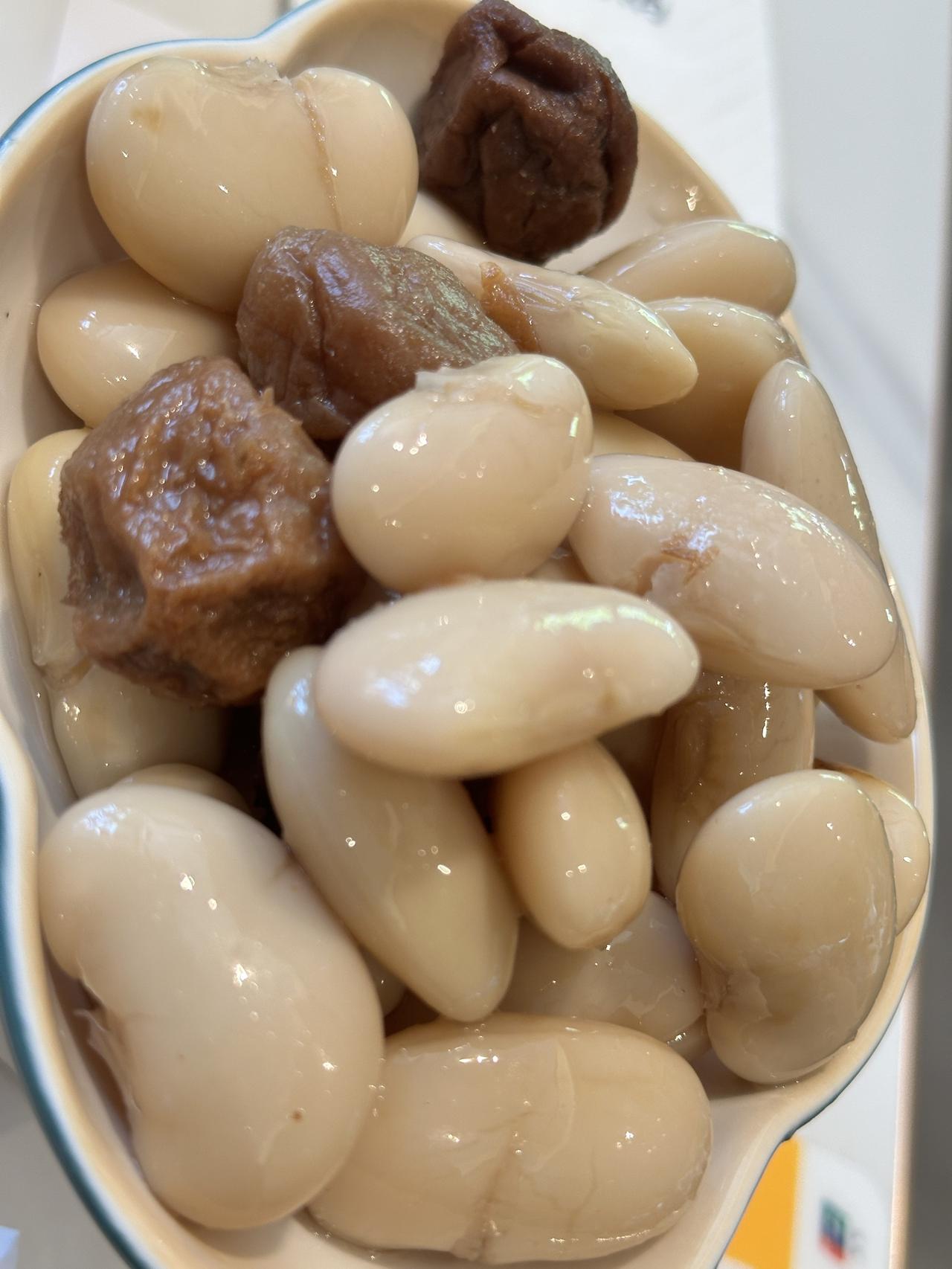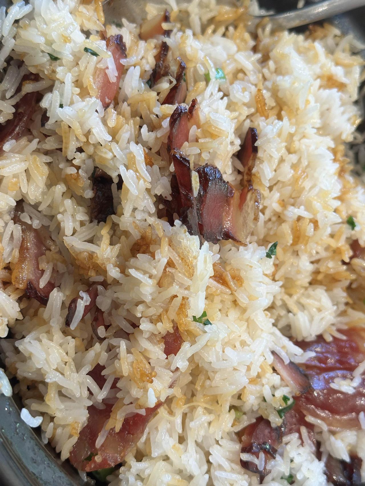 他家的菜品表现中规中矩。烧鹅看样子是配送而来,好在没有反复加热,肉质偏瘦,皮脆肉有韧性,味道很不错。话梅芸豆同样中规中矩,腌制得十分入味,量也挺足。煲仔饭也尚可,腊肉和腊肠给得不少,锅底基本还有些锅巴。