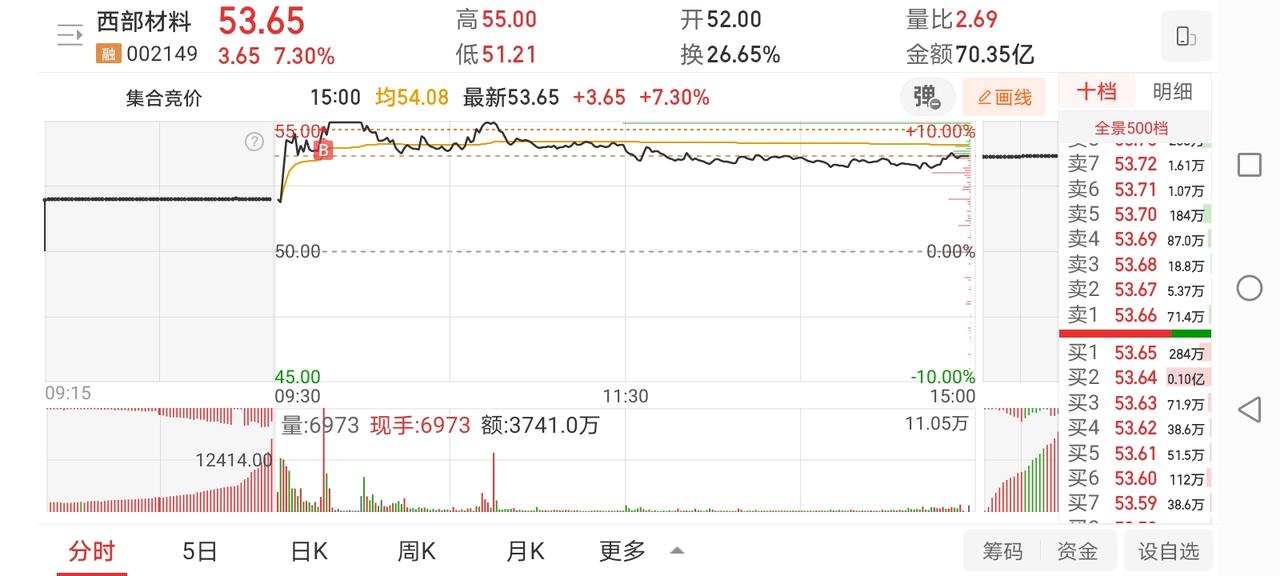 西部算是今天早盘少有的比较好的接力个股,从情绪上讲,打板的买点并没有太大问题,毕竟早盘整个商业航天方向是非常强势的,巨力开盘迅速拉升,这些其实都是给西部助攻的,可惜它自己不给力,不过从今天西部早盘的承接看,今天板上是进了不少大资金的,虽然炸板,隔日是有修复预期的,再加上小胖近期做的硬板都没溢价,说不定炸板股反而有好运气,所以这种模式内的小面还是能够接受的!