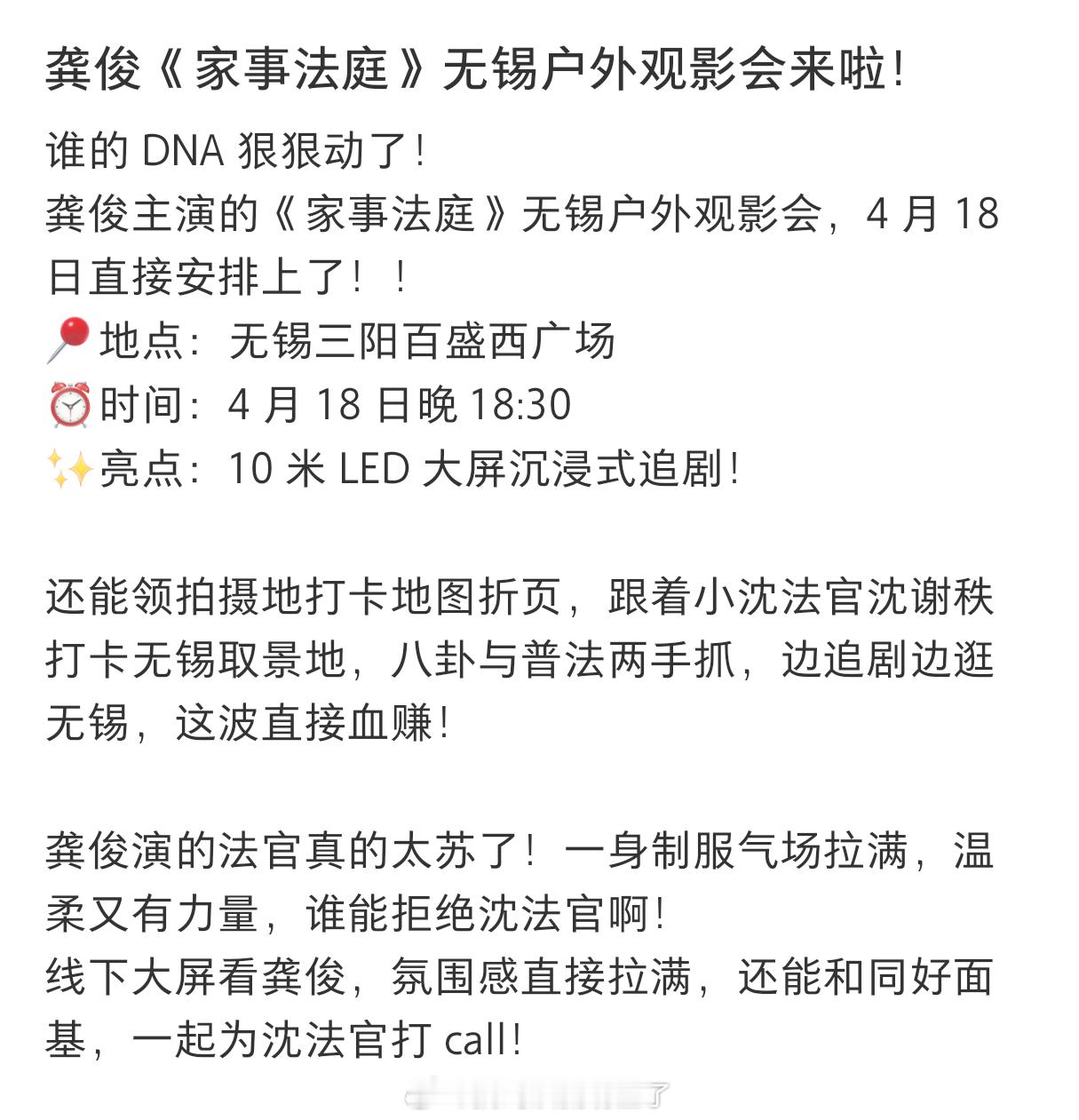 无锡给龚俊《家事法庭》举办了户外观影会!听说之前已经有不少剧粉去取景地打卡了,这波又是带动文旅又是带动周边文创的,这剧播得真好啊,当地也挺重视家事法庭