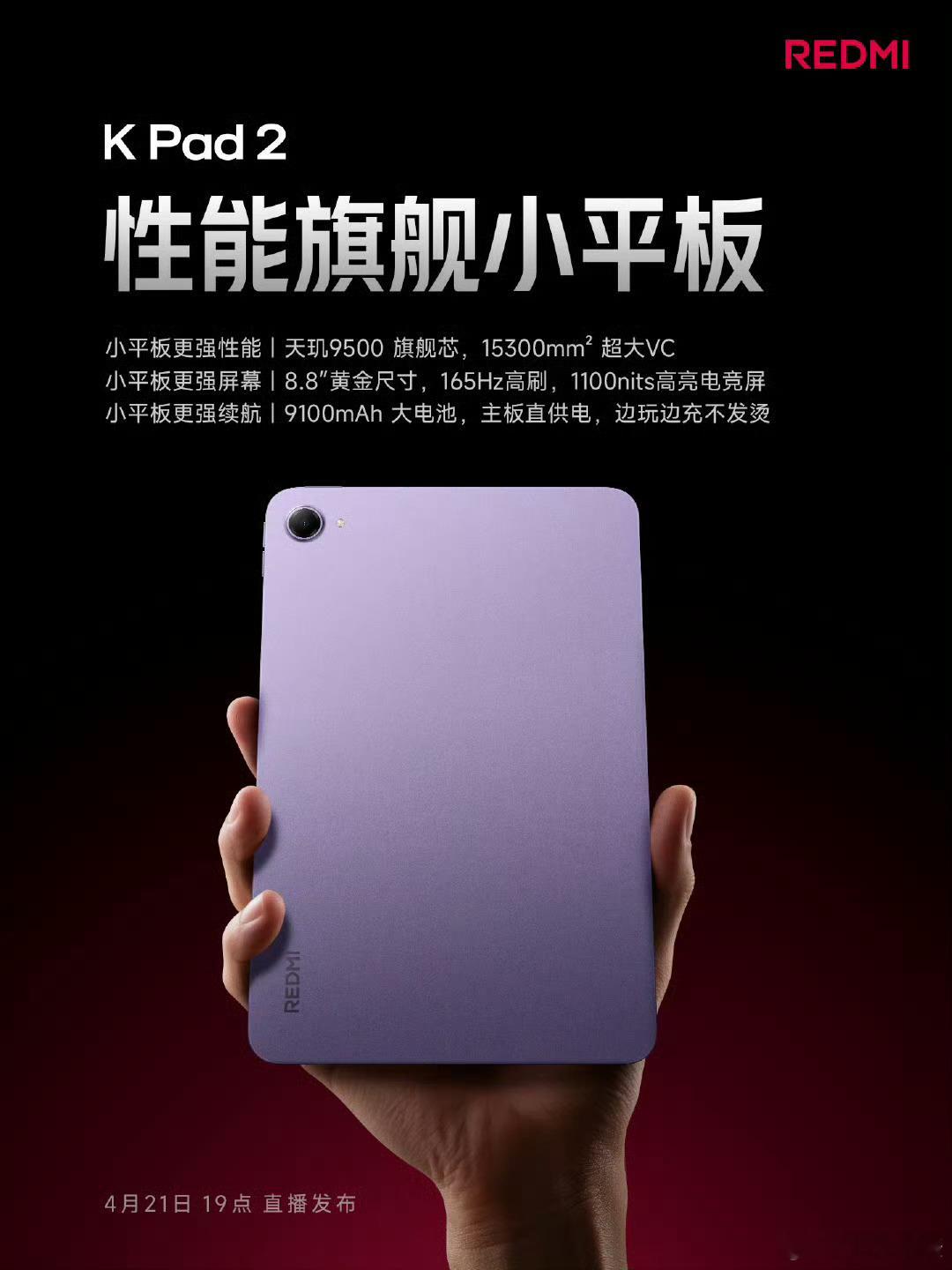 8.8英寸 3K 165Hz LCD屏, 天玑9500,67W+9100mAh, 双X轴马达,液冷VC芯片中置散热架构,双C口(USB3.2 Gen1),侧边指纹识别, 三款配色:电光紫、太空银、深邃黑。KPad2