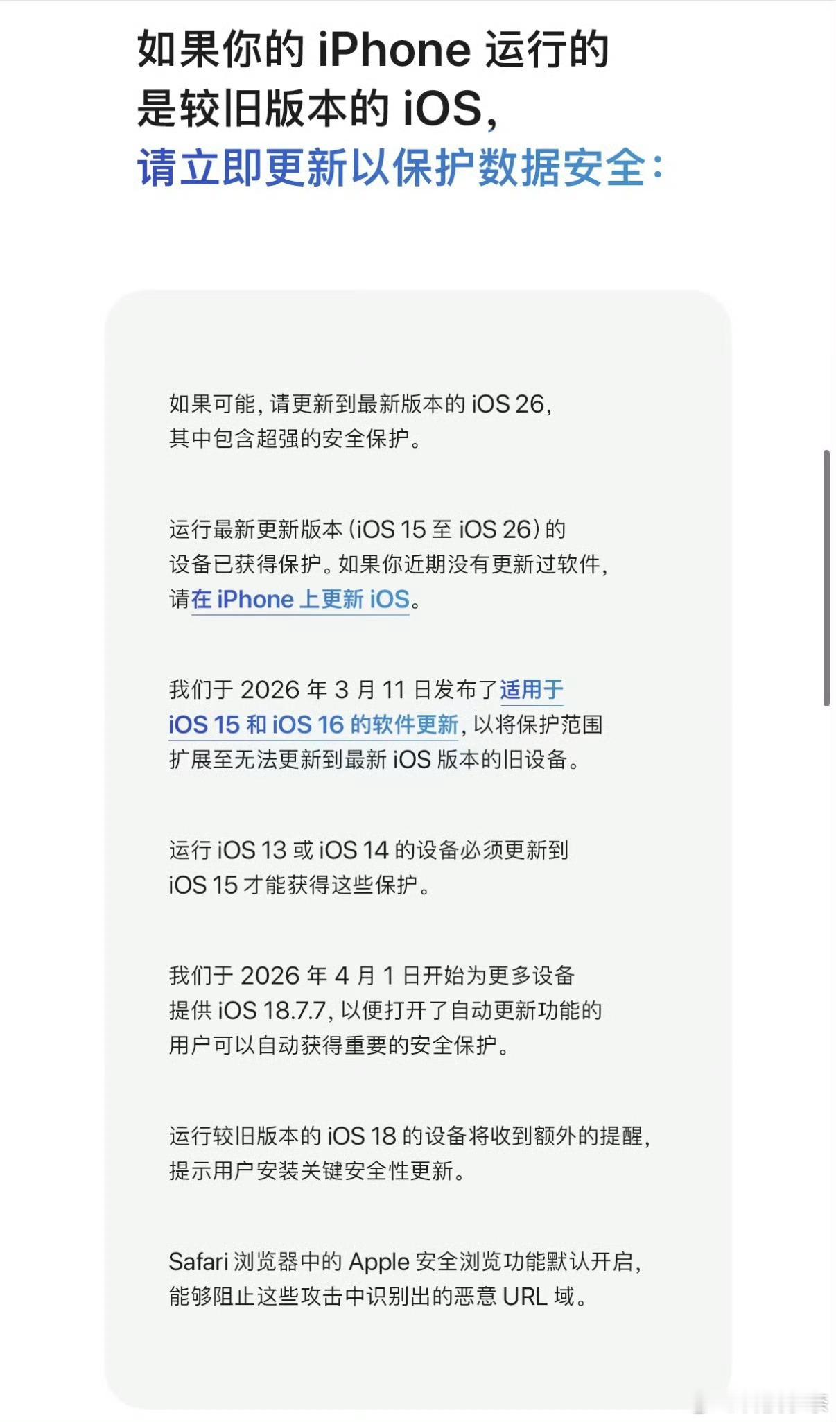 但这波此前工信部也发过风险提示,提醒iPhone 用户升级系统,避免导致信息泄露、系统受控等严重危害。所以这波能升就升,实在不想就管住手别瞎点链接了。
