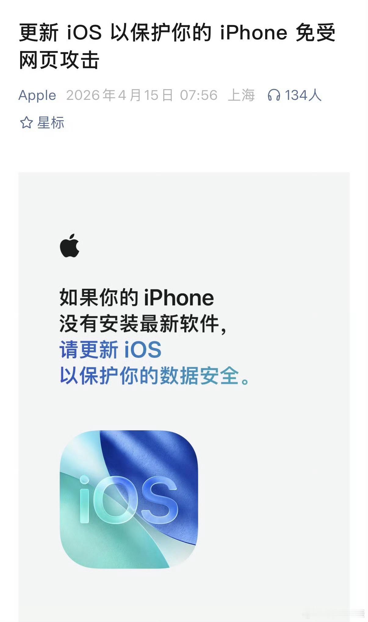 苹果官方发文提醒 苹果官方发文提醒,尽量把 iPhone 升级到最新 iOS 系统,来保护 iPhone 免受网页攻击,并表示目前新版本系统已解决相关漏洞并能阻断攻击。