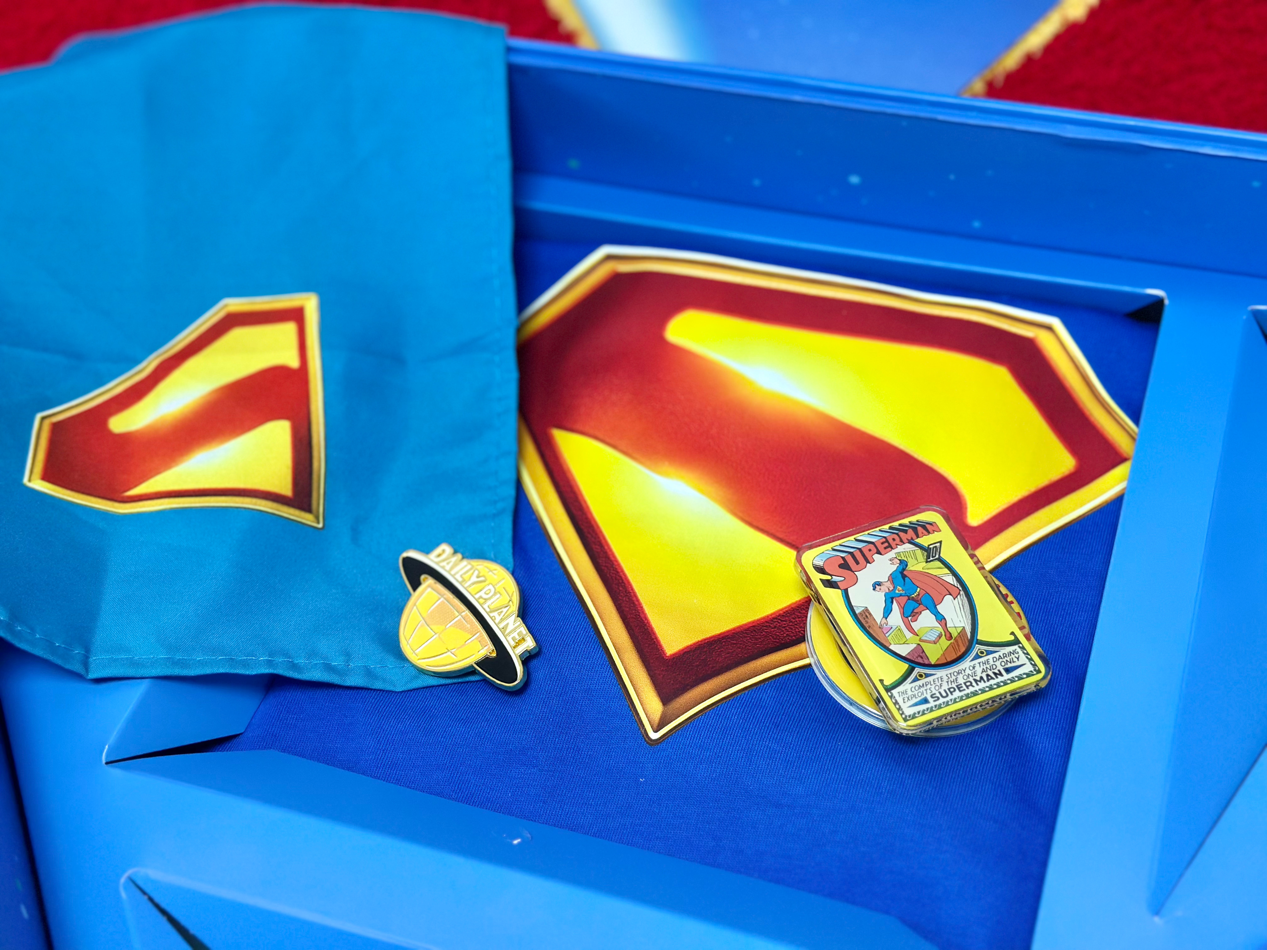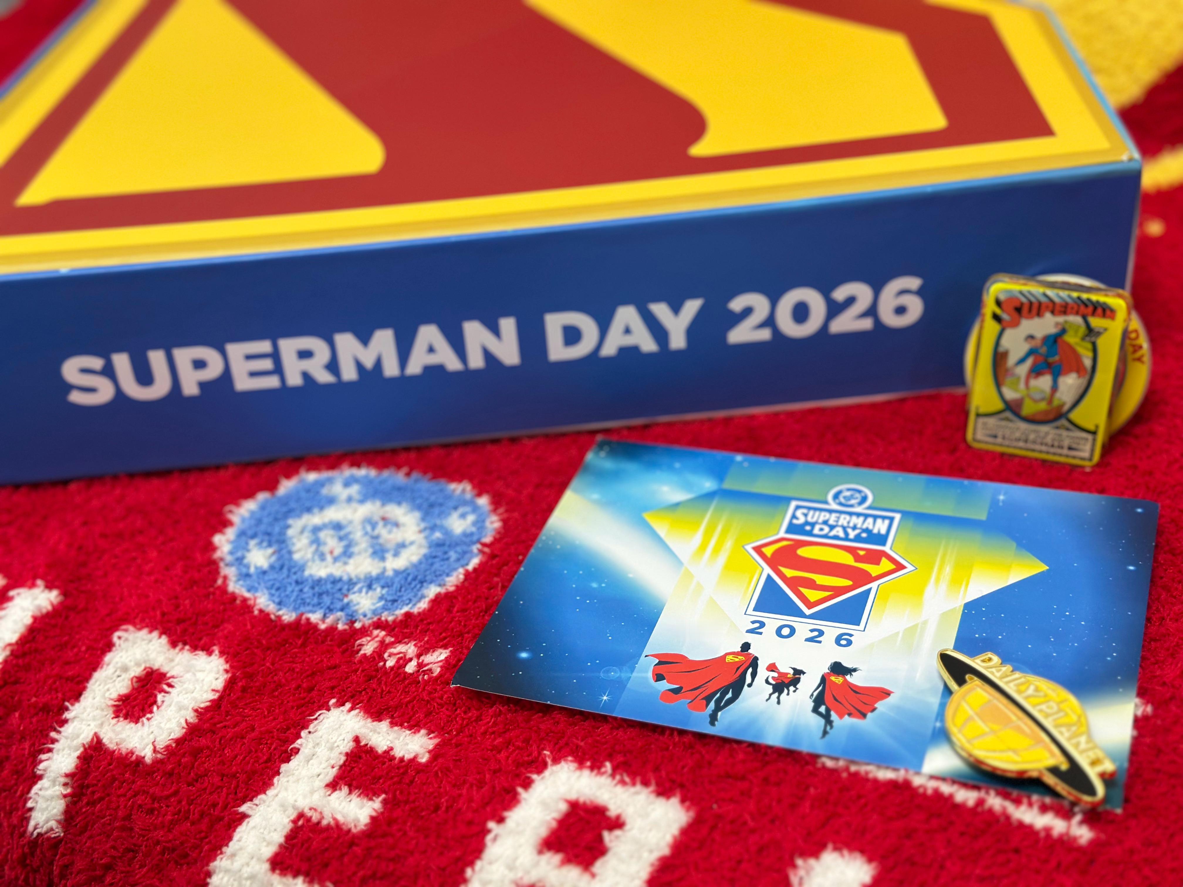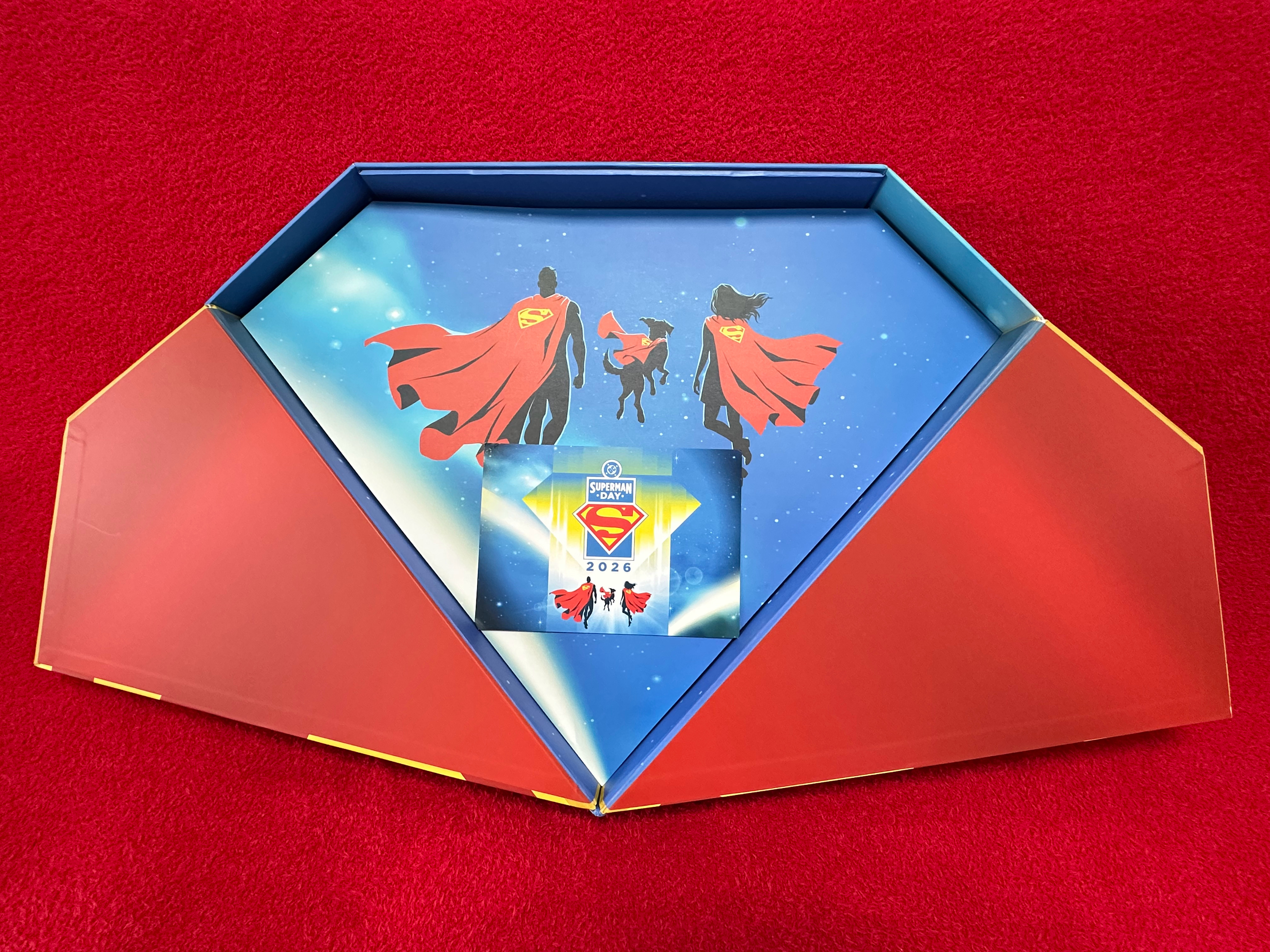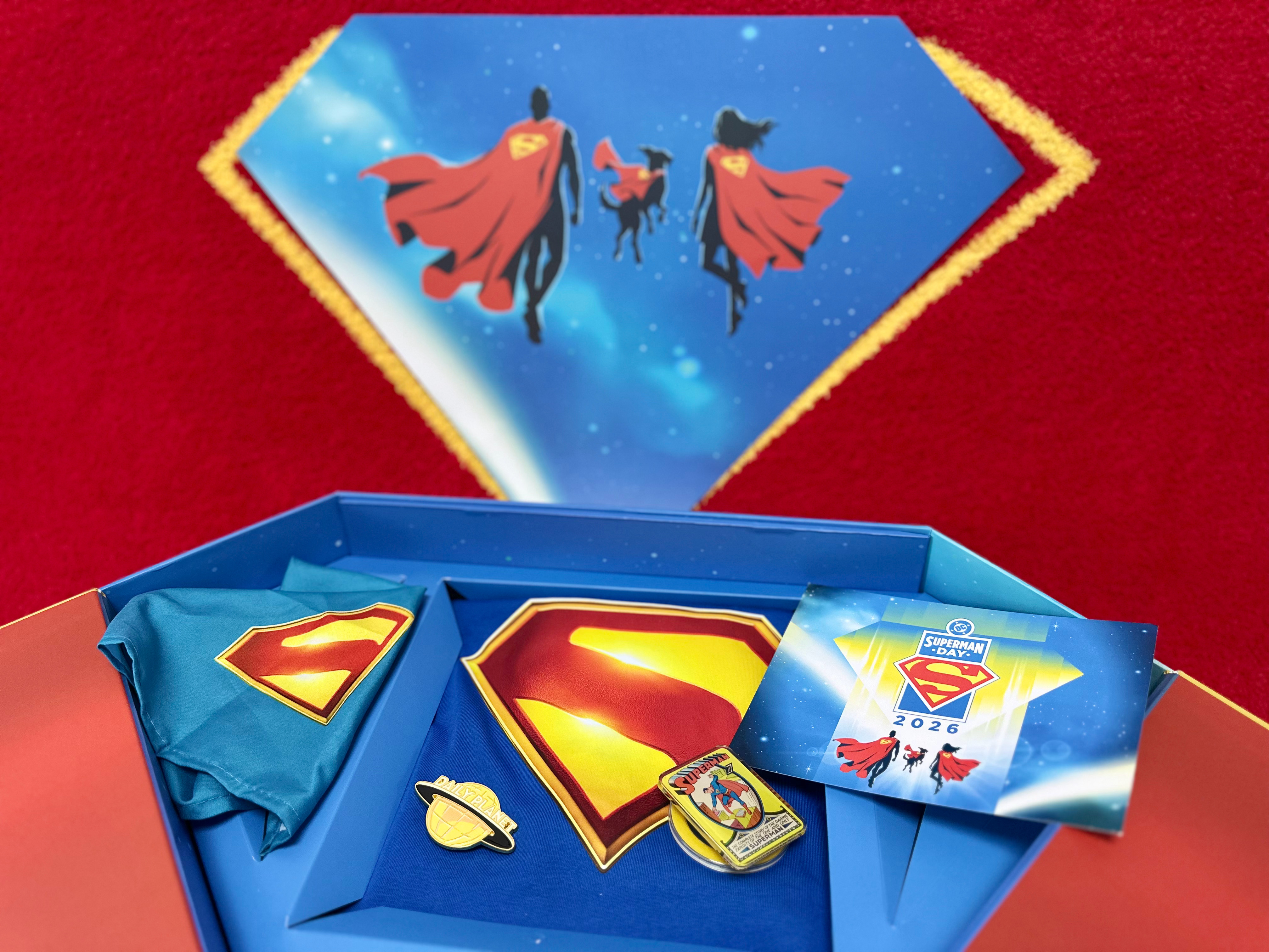周边 值此2026超人日 即将到来之际,官方限定礼盒也如约而至——尺寸巨大且造型美观的超人盾形logo外盒,内容物含带超人日主题背标的超人T恤,宠物用围巾、精美的冰箱贴和手机支架等等,每样都令人爱不释手。