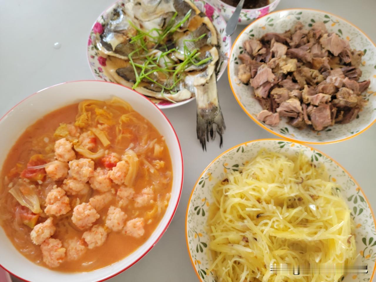 姐姐做了四道菜,一是猪拆骨肉、二是炒土豆丝,三是清蒸鲈鱼,四是茄汁虾滑丸。主食是苞米大碴子水饭。