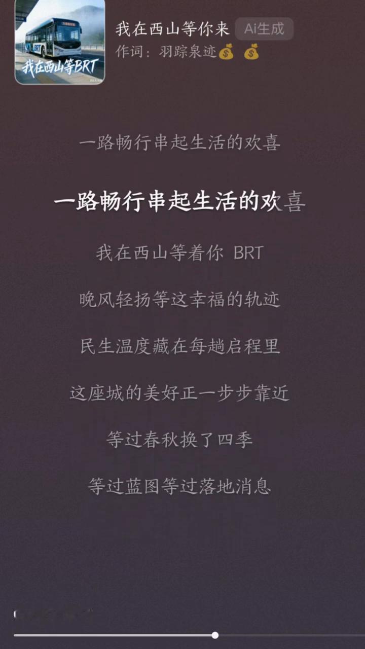 我在西山等着你BRT,迎着晨光载着烟火来这里。万泰阳光悦府山水紧相依,一路畅行串起生活的欢喜。晚风轻扬等这幸福的轨迹,民生温度藏在每趟启程里。这座城的美好正一步步靠近。等过春秋换了四季,等过蓝图等过落地消息。我们守在这片热土从未离去,就为等这趟满载希望的轨迹。