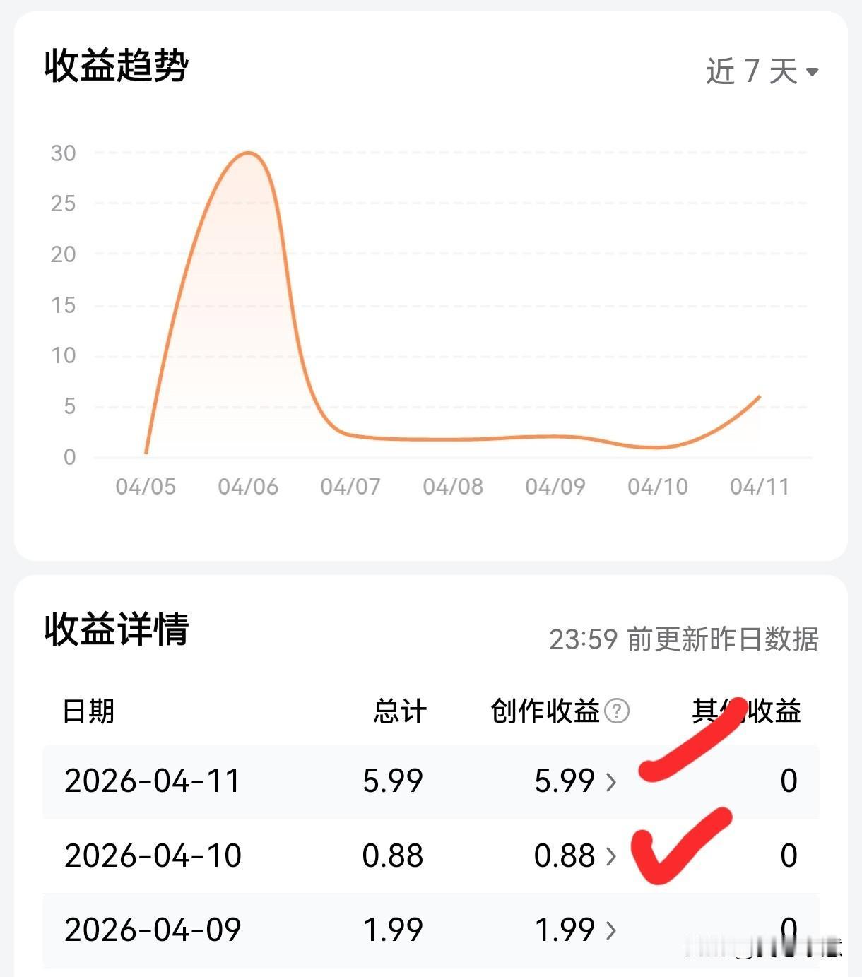 感觉自己今天中了大奖!万万没有想到,昨天才3116的阅读量,竟然获得5.99元的收益。一开始,我还以为会不会有其它的收益,翻查后才恍然大悟,原来是千次阅读单价的缘故!