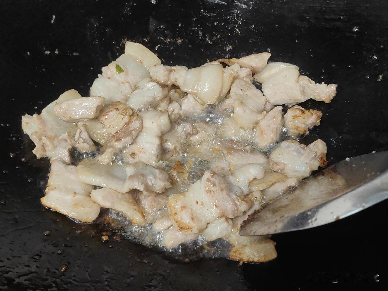 一切准备就绪,起油锅,先把五花肉炒至变色出油,在锅里发出嗞嗞的声音,一般肉香扑鼻而来。这时,先后把所有食材分次投入锅里翻芹,加点清水再焖一下,最后放调味料翻炒均匀就可以出锅了。