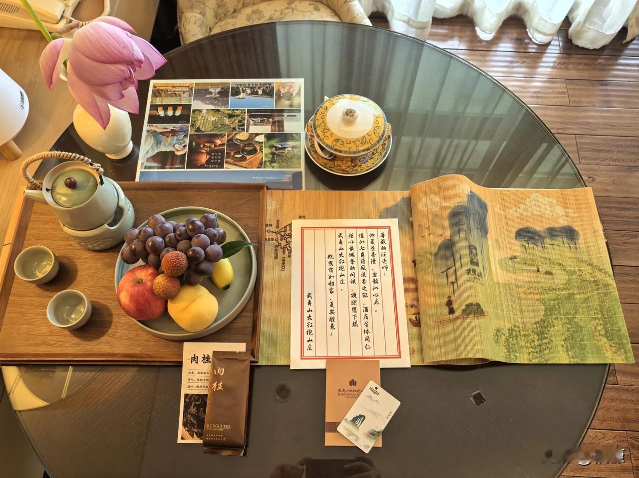 入住三楼的套房,欢迎礼没有酒店惯常的甜品、巧克力模具造型(黑巧的气味会很重,我遇到都会让服务员撤掉);桌上一盘水果,一碗莲子汤,一包肉桂岩茶,袅袅白烟是茶味的喷雾,混着让人放松的音乐,毛笔字体的欢迎信,竹帘底的武夷山风光和游览地图,仪式感在客房就感受足了,充分体现出“国内首家大红袍茶文化主题酒店”的主题。莲中餐厅也是蝉联的“鼎舍奖——中国最值得体验的酒店餐厅”。