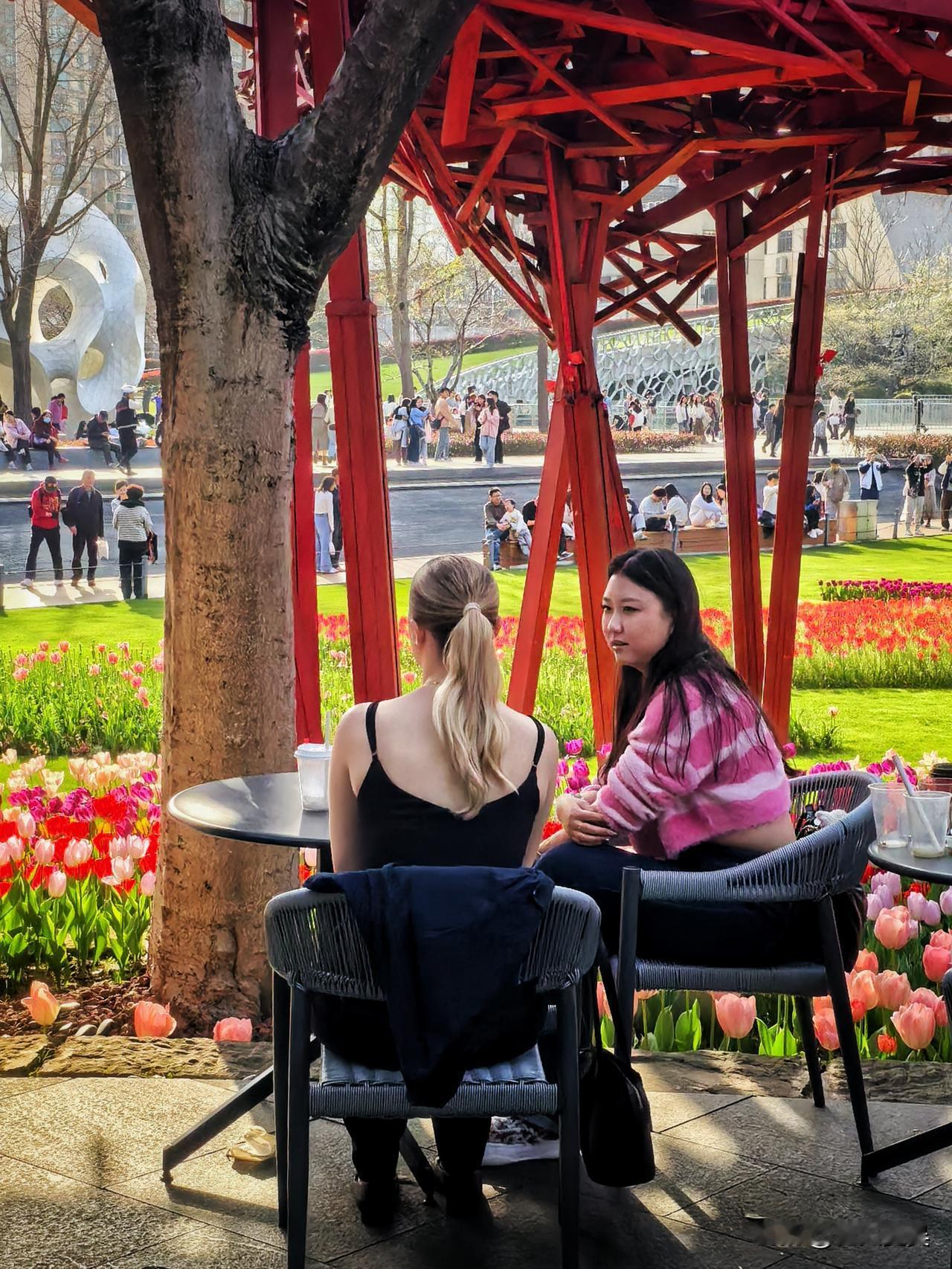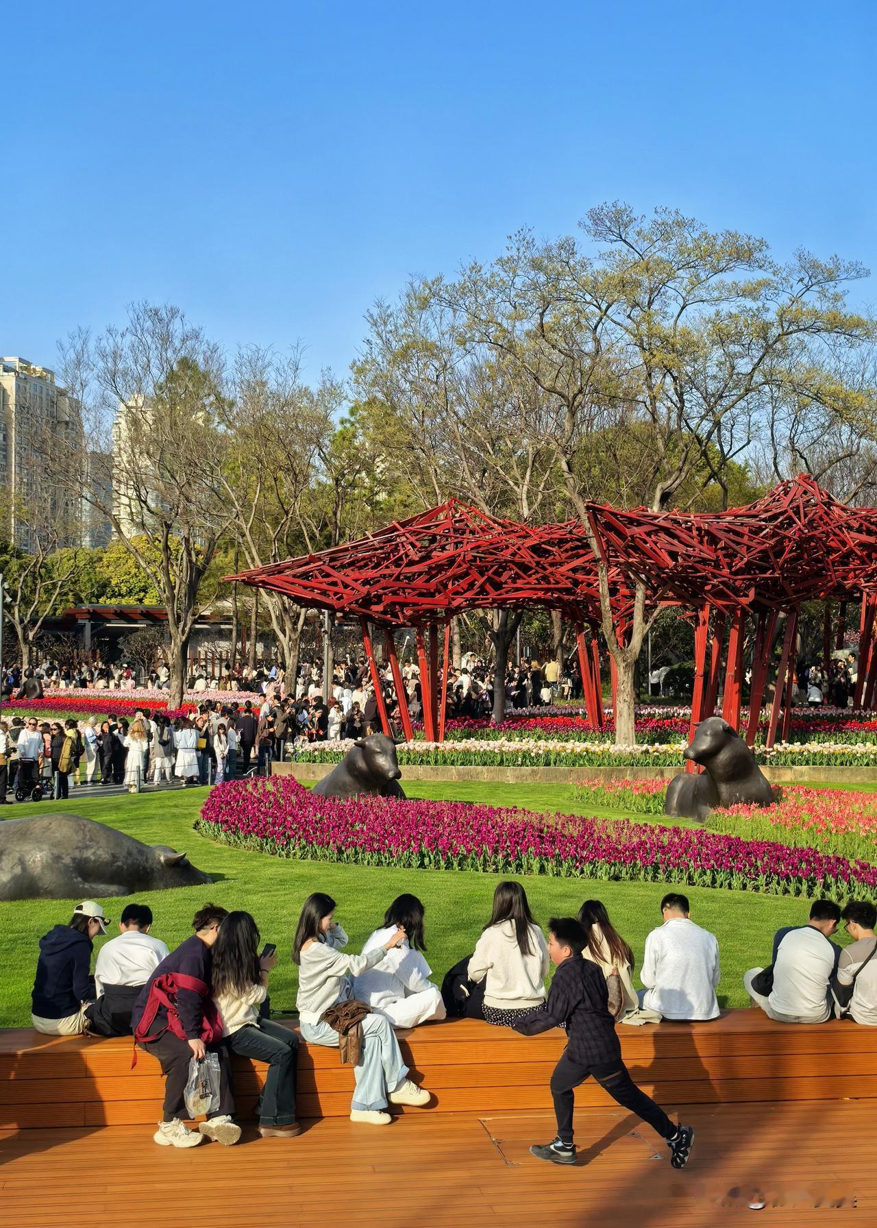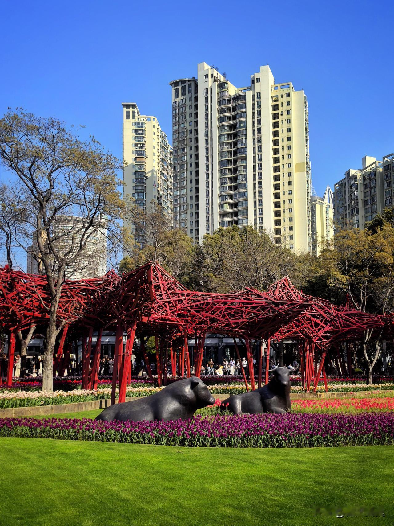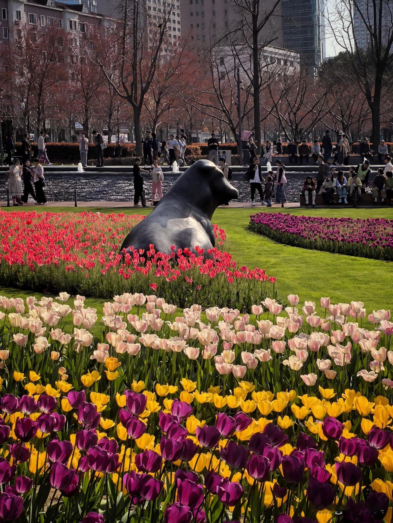 最绝的是花丛里藏着几座酷牛雕塑,冷峻的古铜色和花瓣的娇嫩混搭在一起,居然毫无违和感。好多小姐姐蹲着拍特写,个个露出灿烂的笑容,阳光洒在郁金香上,那个画面真的令人心动。