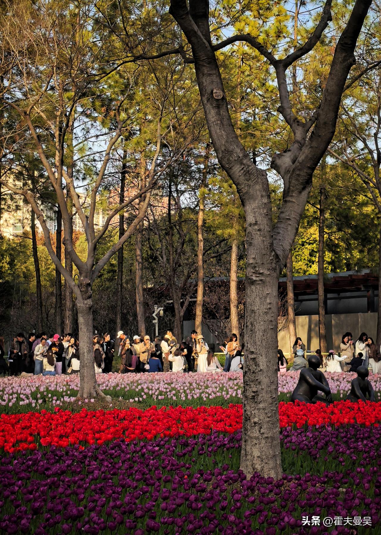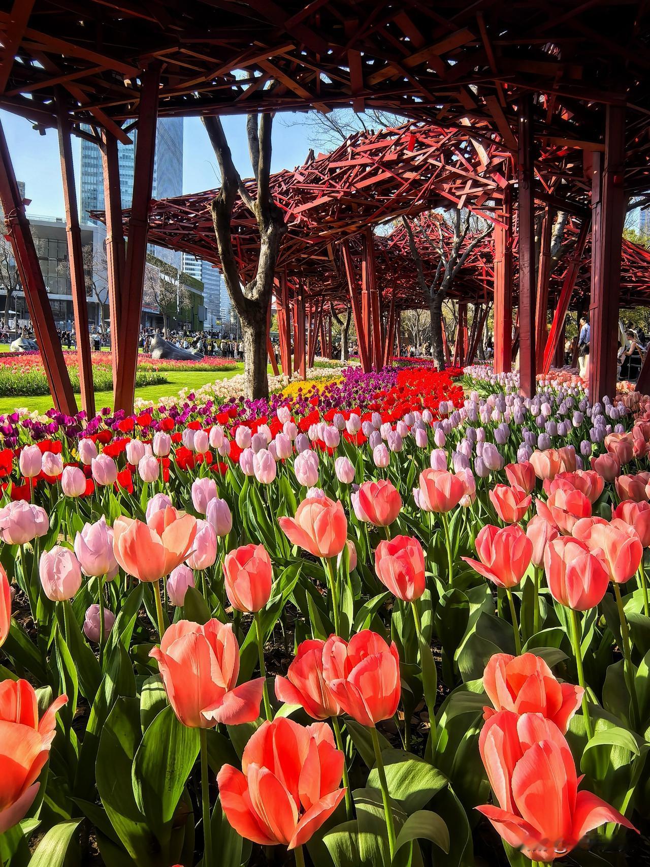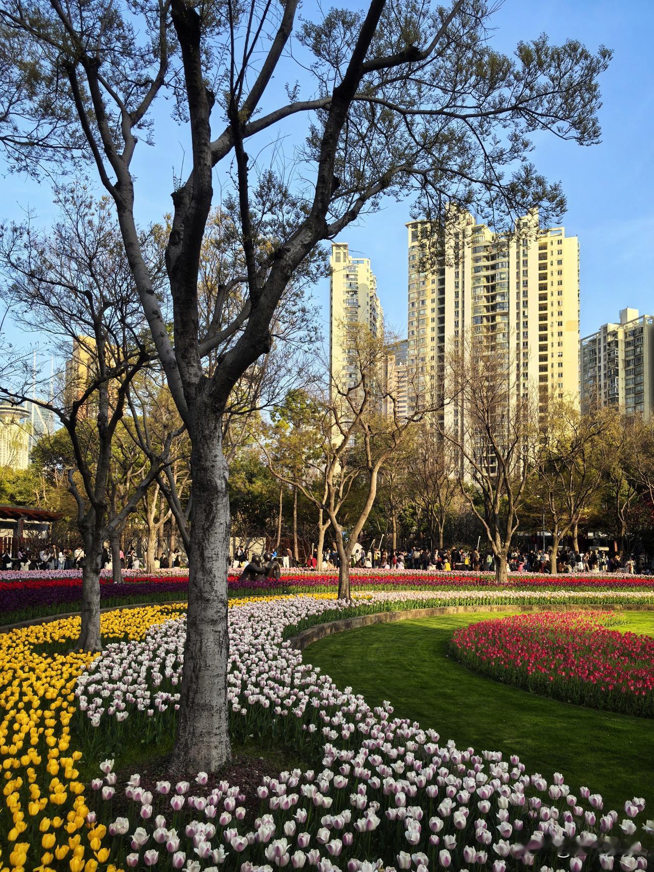 前个周末就想去静安雕塑公园,结果下雨没去成。这个周末阳光好到爆,果断决定必须得去拍一拍。一进公园,就被眼前五彩斑斓的郁金香花海美到了,微风一吹,整片花田像打翻了调色盘,波浪似的晃起来,说这景美如画,真是一点不夸张。