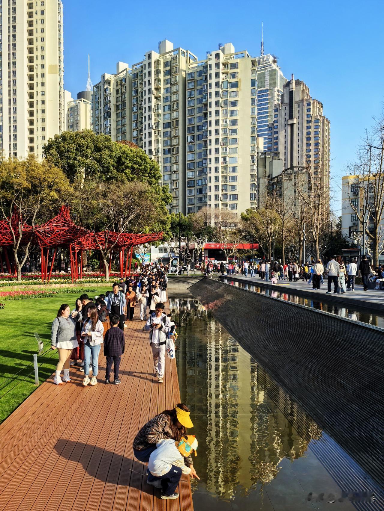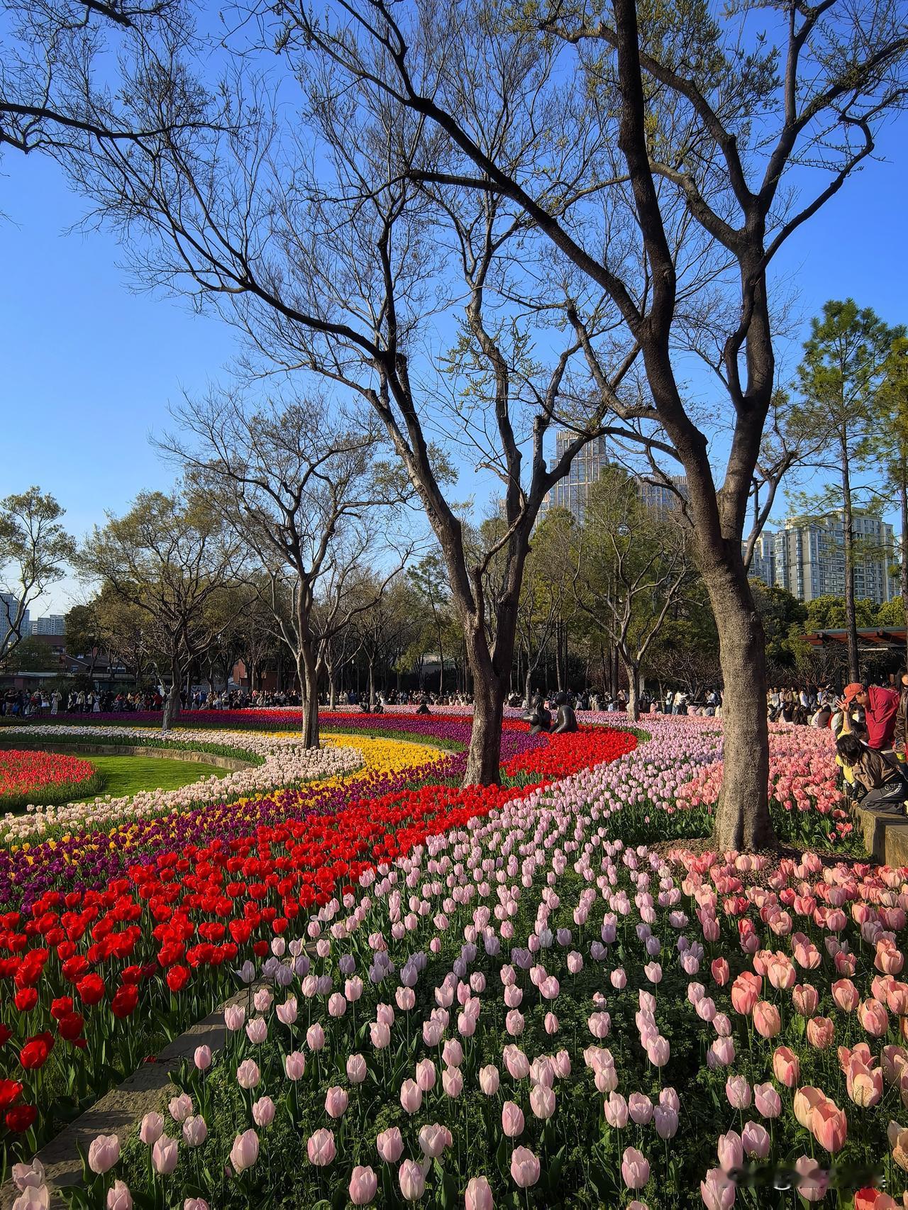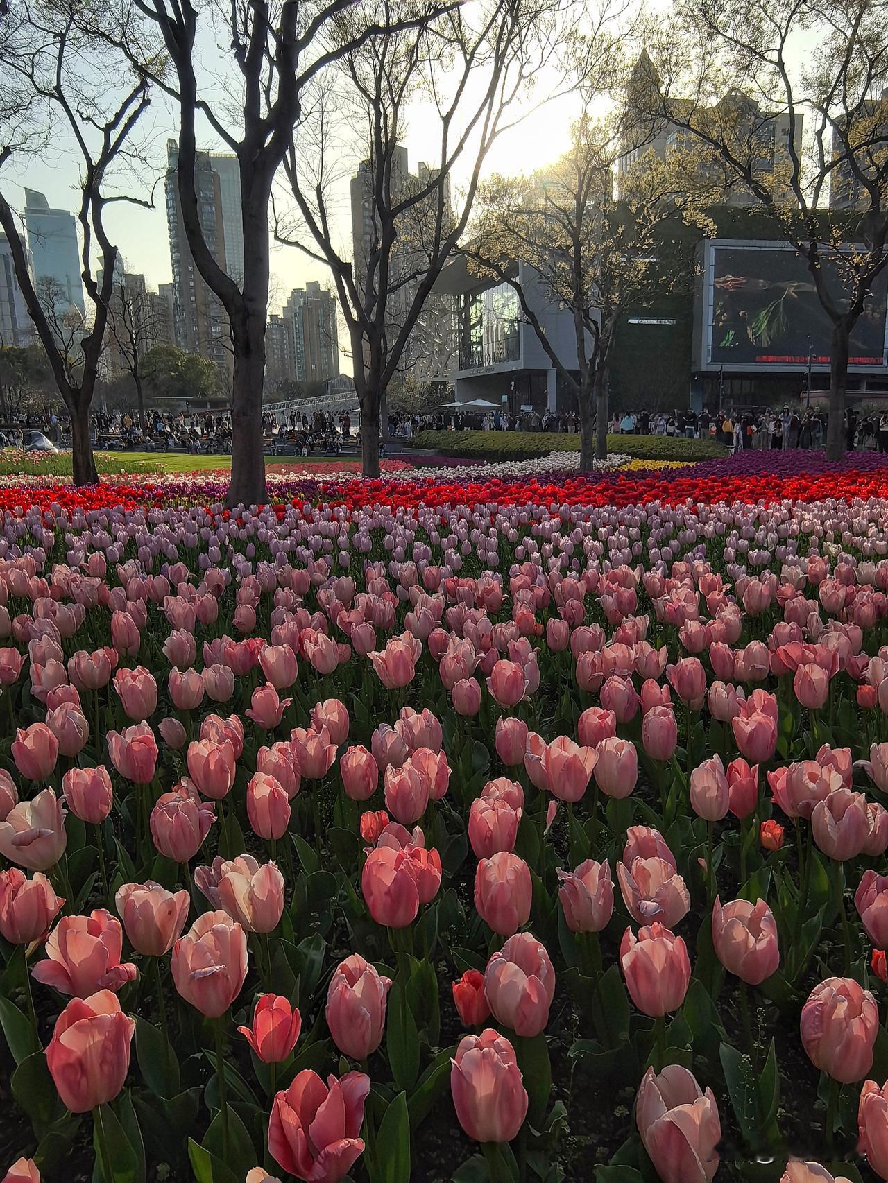 前个周末就想去静安雕塑公园,结果下雨没去成。这个周末阳光好到爆,果断决定必须得去拍一拍。一进公园,就被眼前五彩斑斓的郁金香花海美到了,微风一吹,整片花田像打翻了调色盘,波浪似的晃起来,说这景美如画,真是一点不夸张。