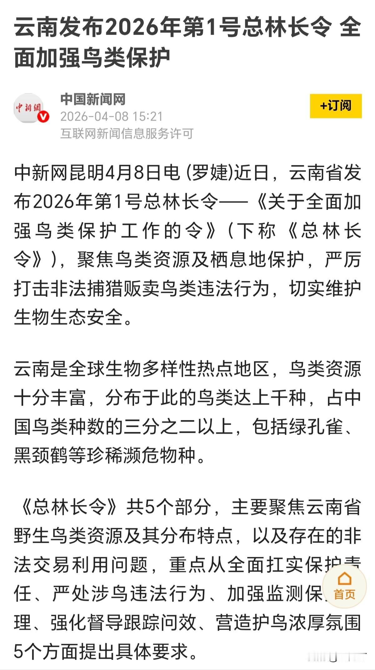近日,云南省正式发布2026年第1号总林长令,将鸟类保护列为年度生态工作头号任务,以严举措、强力度打击非法猎捕、交易、食用野生鸟类等违法行为,全力守护七彩云南生物多样性。