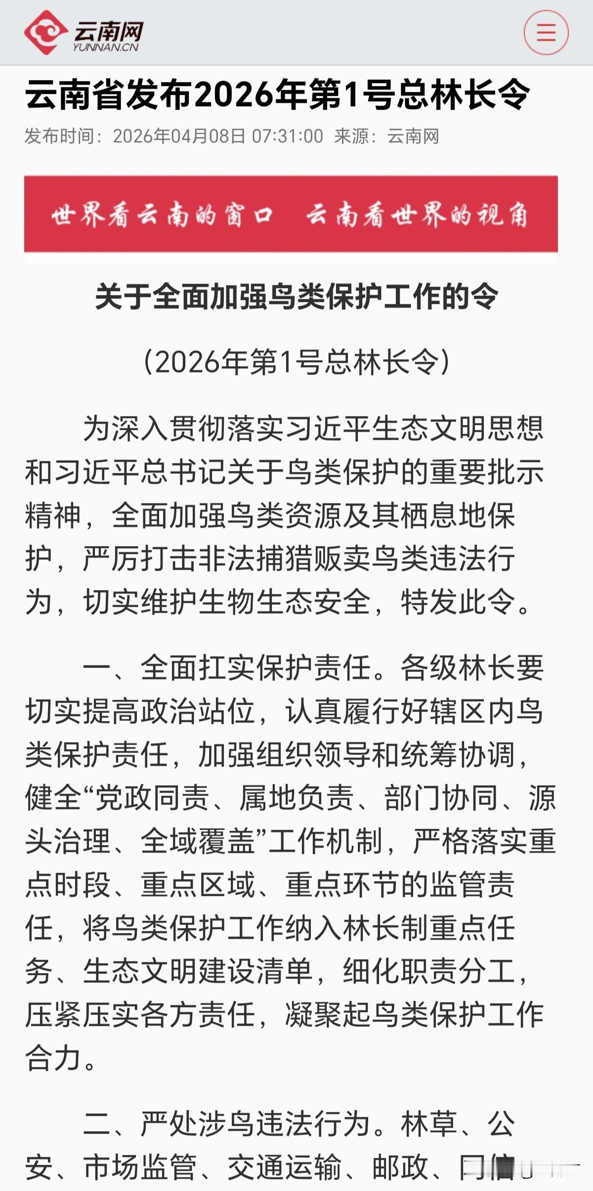近年来,云南生态持续向好,鸟类种群稳步回升,但非法捕猎、交易等隐患仍存。本次“一号令”,彰显云南守护蓝天精灵、筑牢生态屏障的坚定决心。