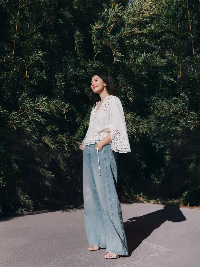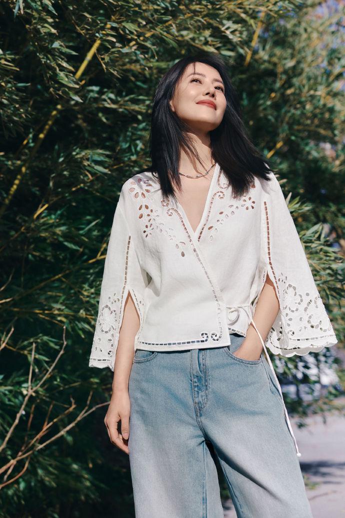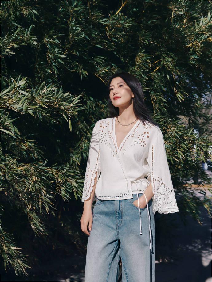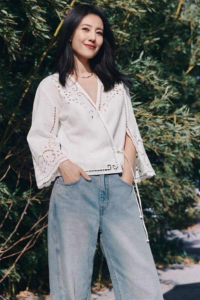 高圆圆上身穿白色雕花上衣,这件上衣的设计很特别,看上去像一件披风,效果很出彩。