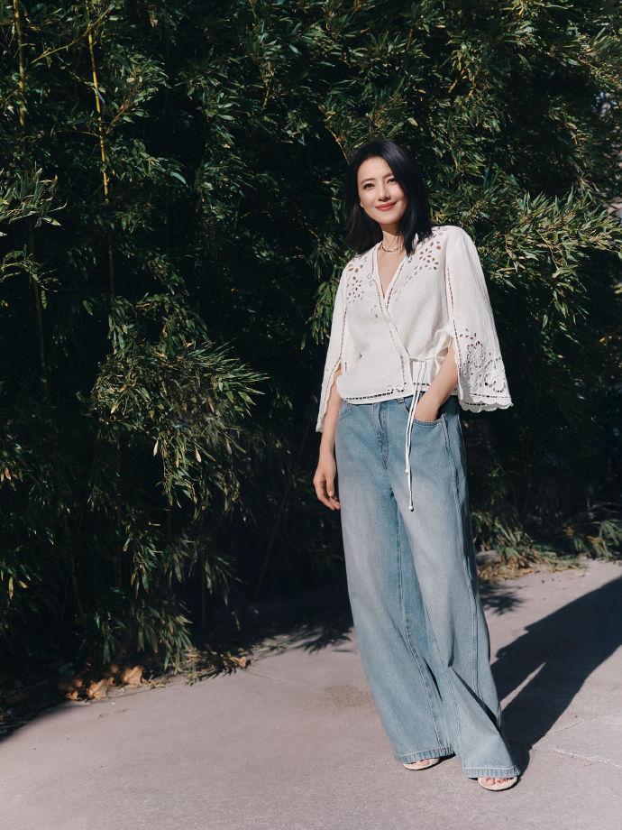 她下身穿做旧风格的水洗牛仔裤,这是一件阔腿裤,她搭配上衣之后显得很洒脱。