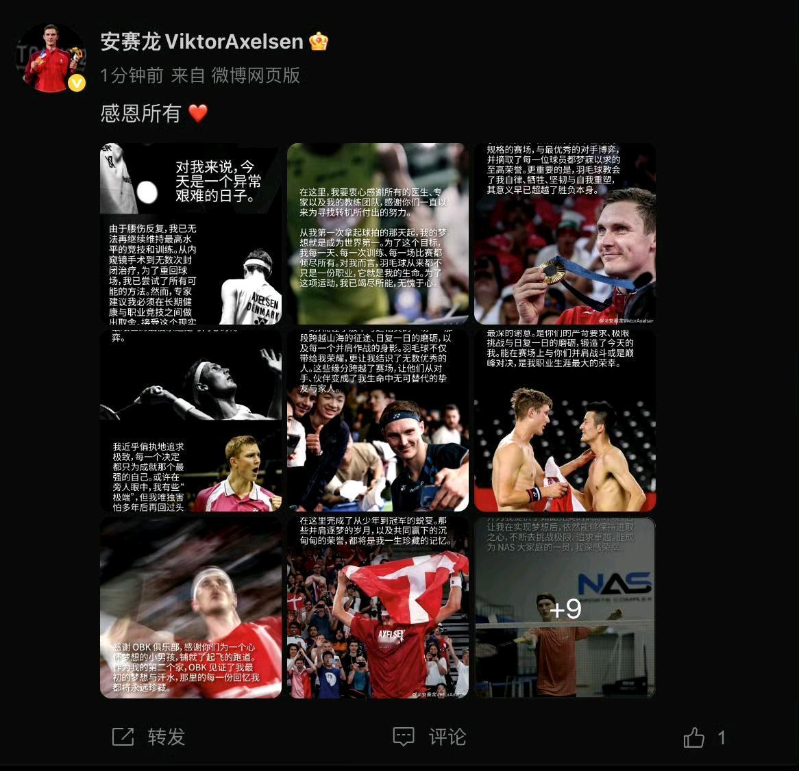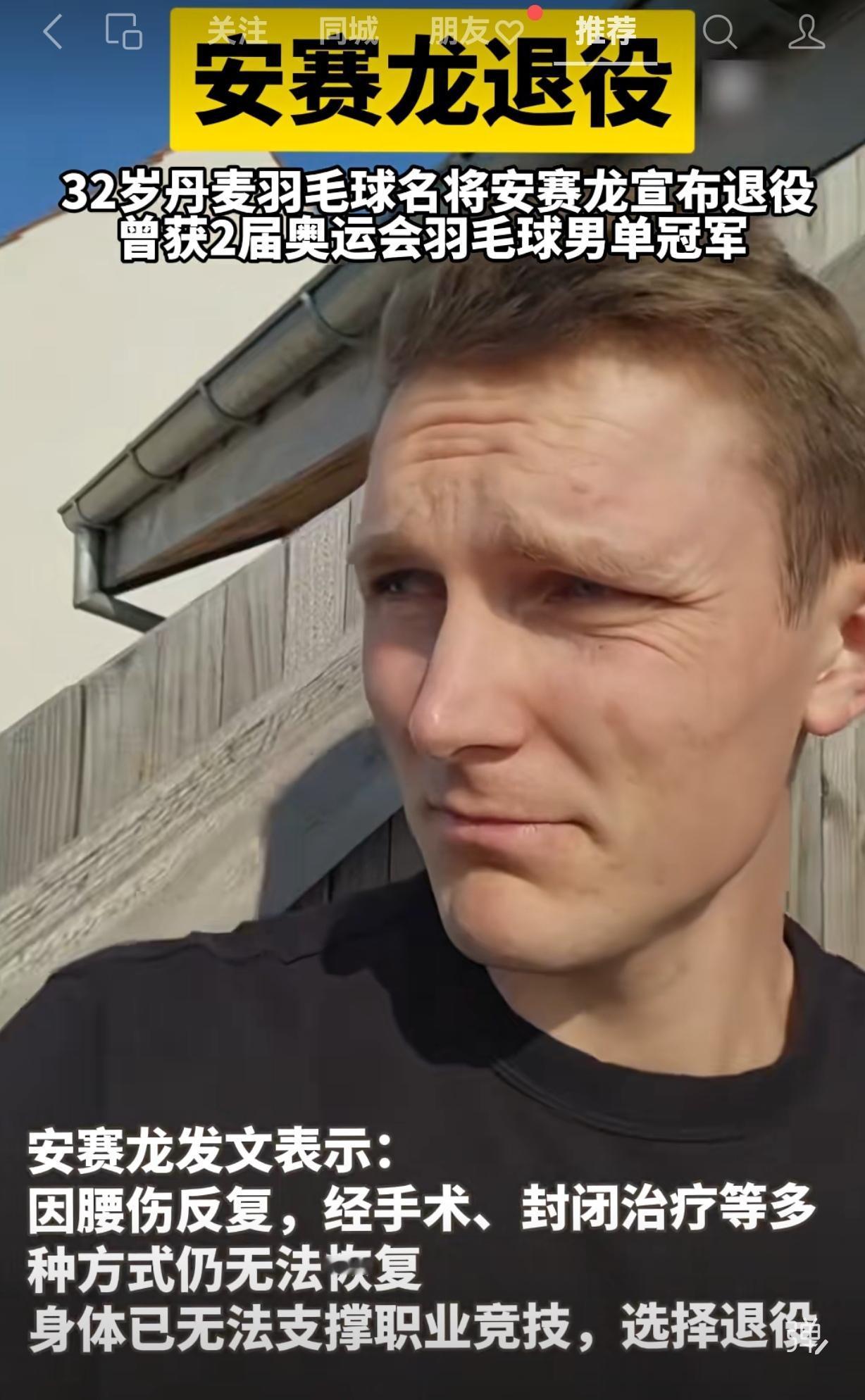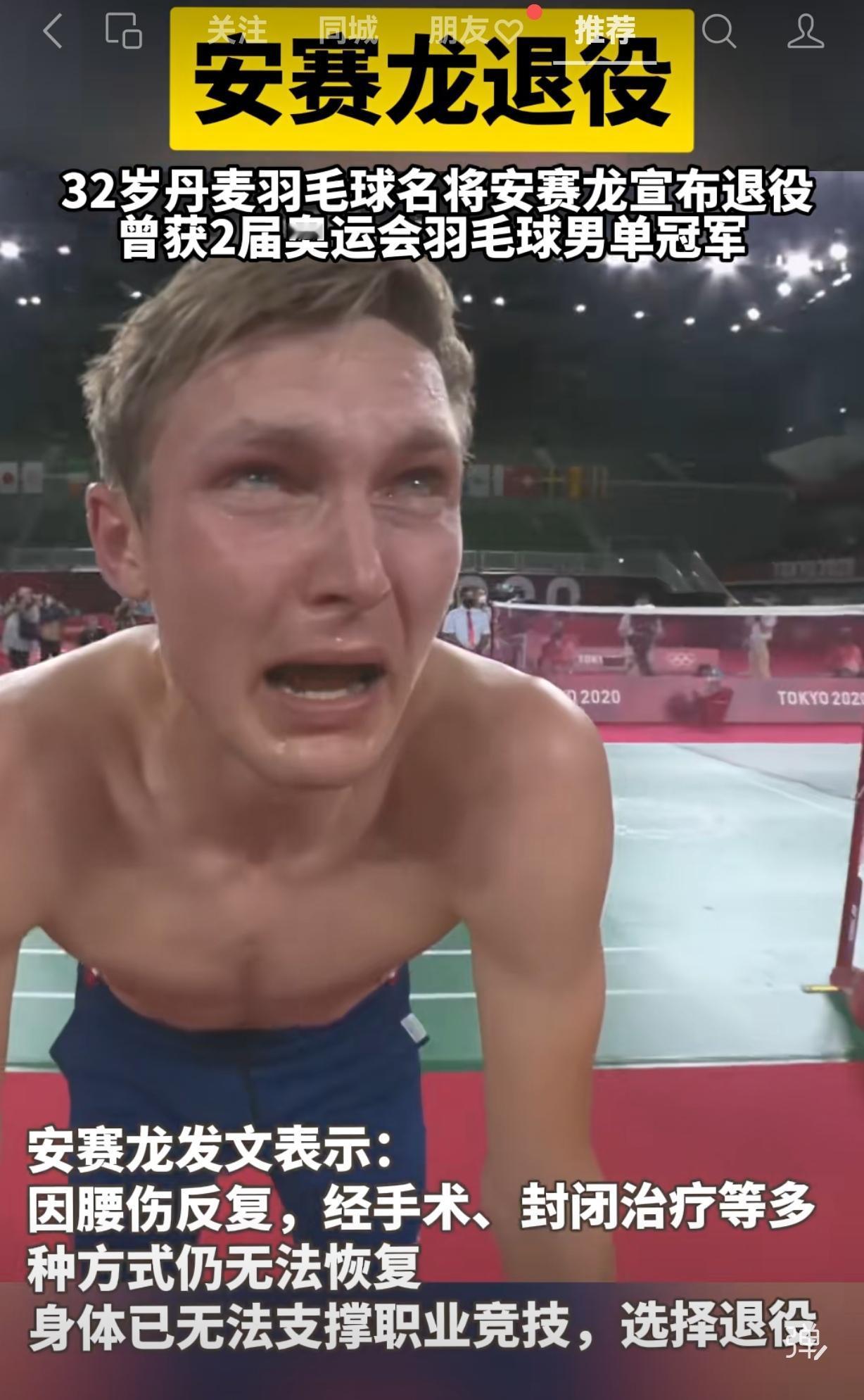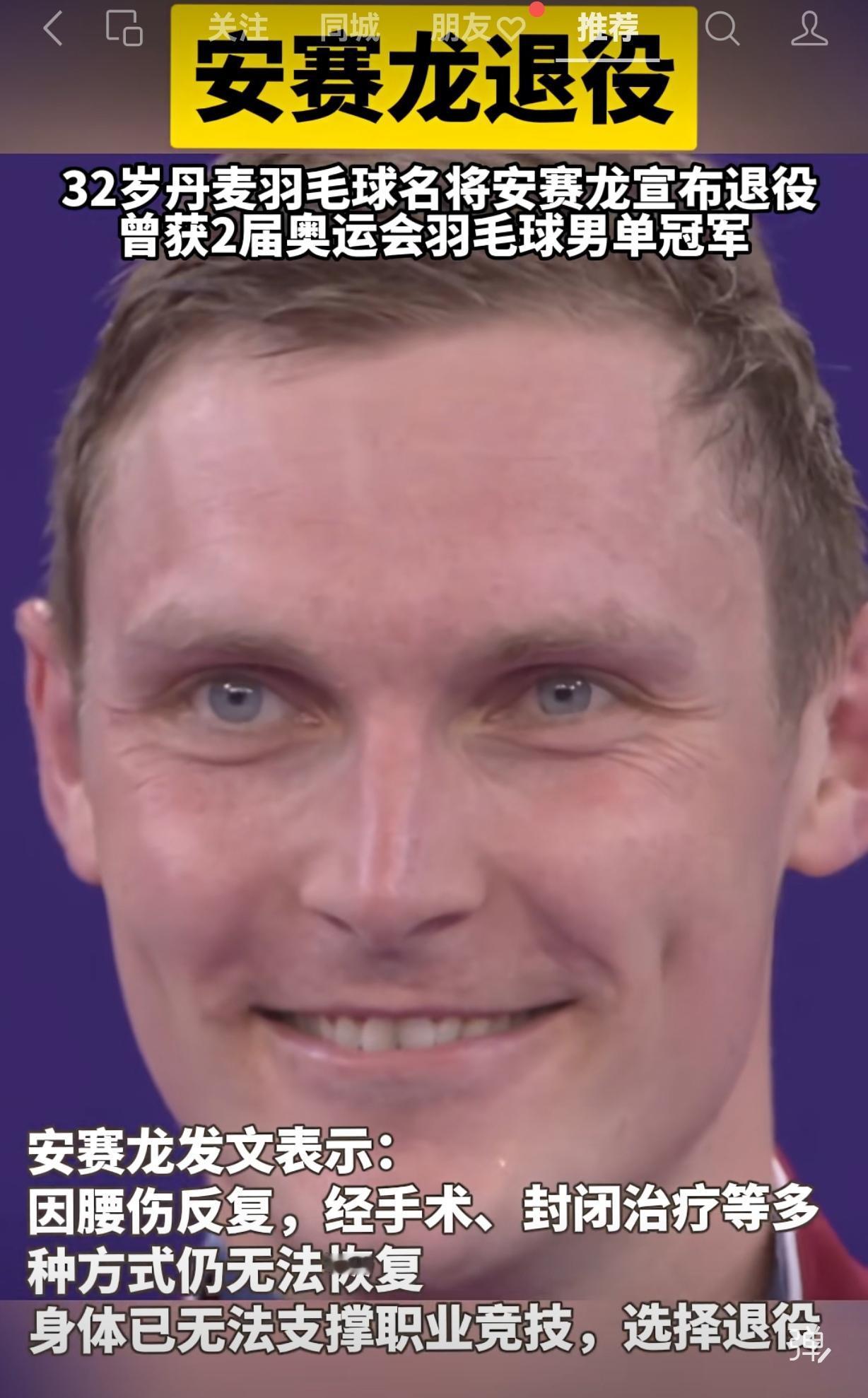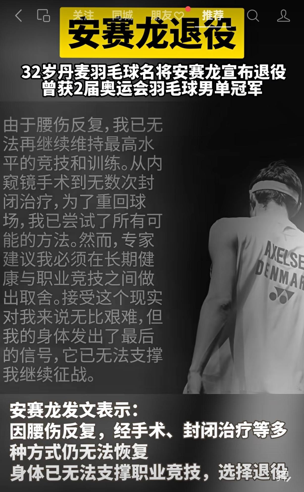 今天下午,安赛龙在微博上发布了退役的消息。安赛龙今年32岁,身高1米92,他把高大和灵活浑然一体,一度称霸世界羽坛,奥运会两连冠,拥有奥运会冠军、世锦赛冠军、汤杯冠军、全英冠军、世界羽联总决赛冠军,在世界羽坛历史上也有了自己的名字。