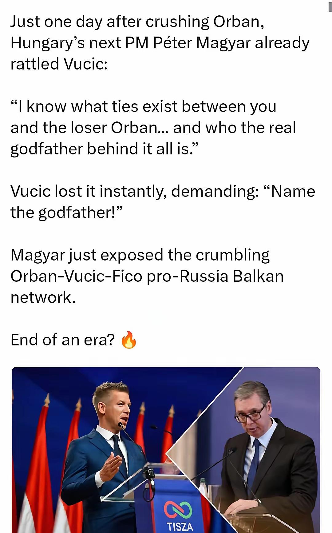 就在击败奥尔班一天之后,匈牙利的信任总理马加尔就向塞尔维亚总统武契奇发起了攻击: