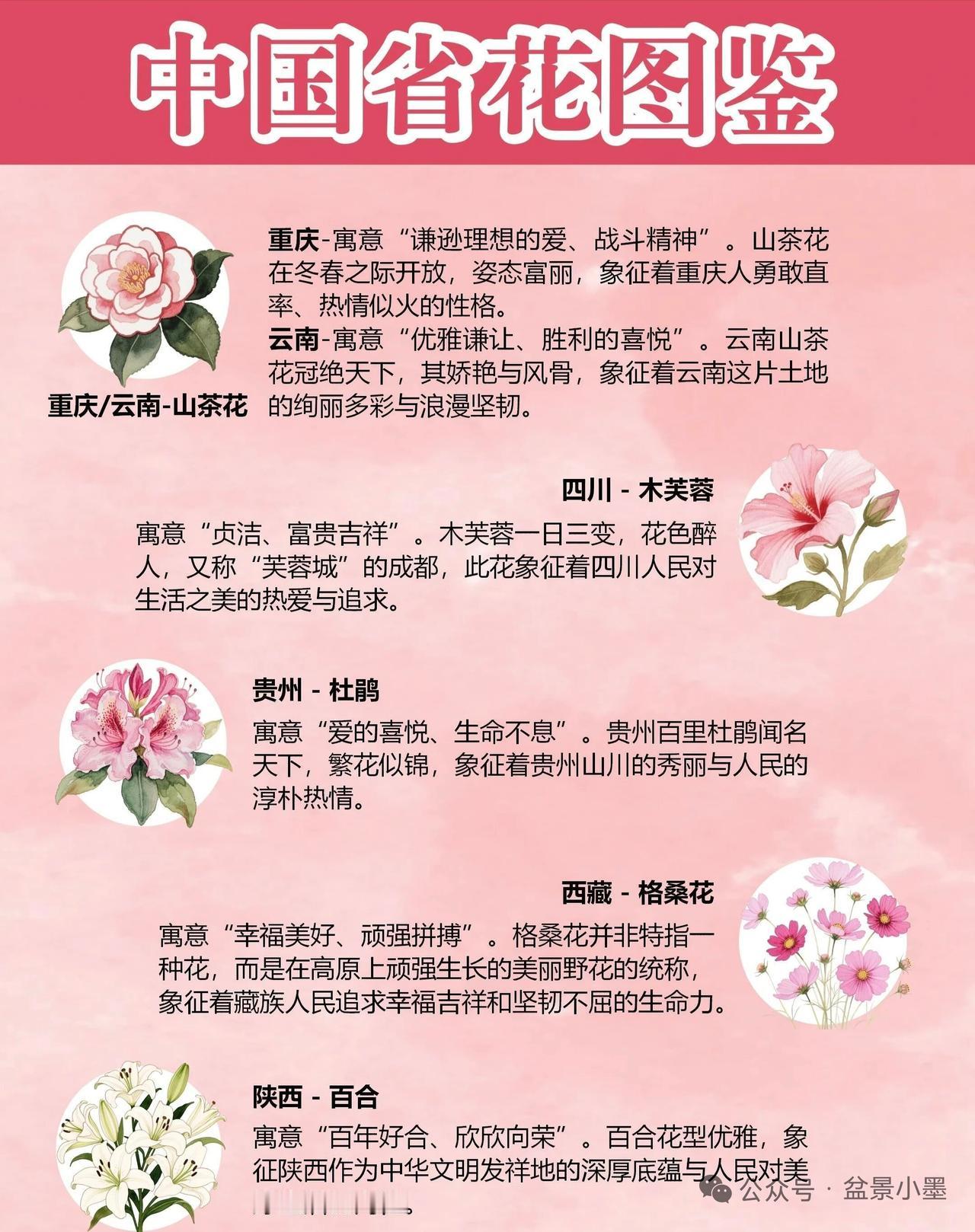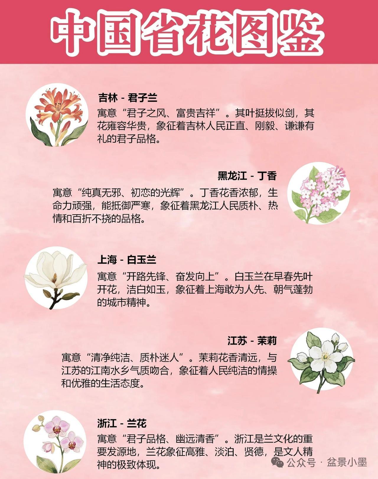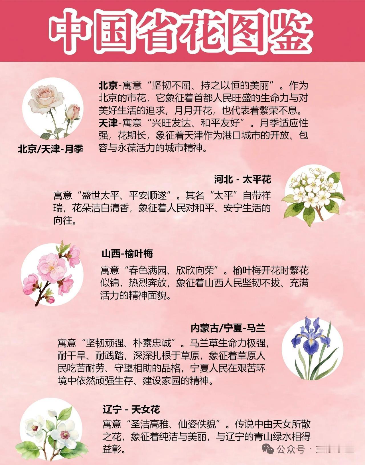 中国地大物博,34个省级行政区的省花各具特色。北京的市花是月季和菊花,月季四季常开充满活力,菊花则带着坚韧雅致。天津也是以月季为市花,皮实好养,象征城市热闹向前。河北的太平花曾是宫廷御用,有着燕赵大地的吉祥寓意。山西的榆叶梅早春开放,让黄土高原有了春日氛围。内蒙古的马兰是草原常见野花,耐冻耐旱,代表着牧民的坚韧。辽宁的天女花是珍稀野花,花瓣洁白如仙女裙摆。吉林的君子兰端庄耐看,在长春家家户户都能见到。这些省花不仅是地域风貌的体现,更蕴含着当地的人文精神。