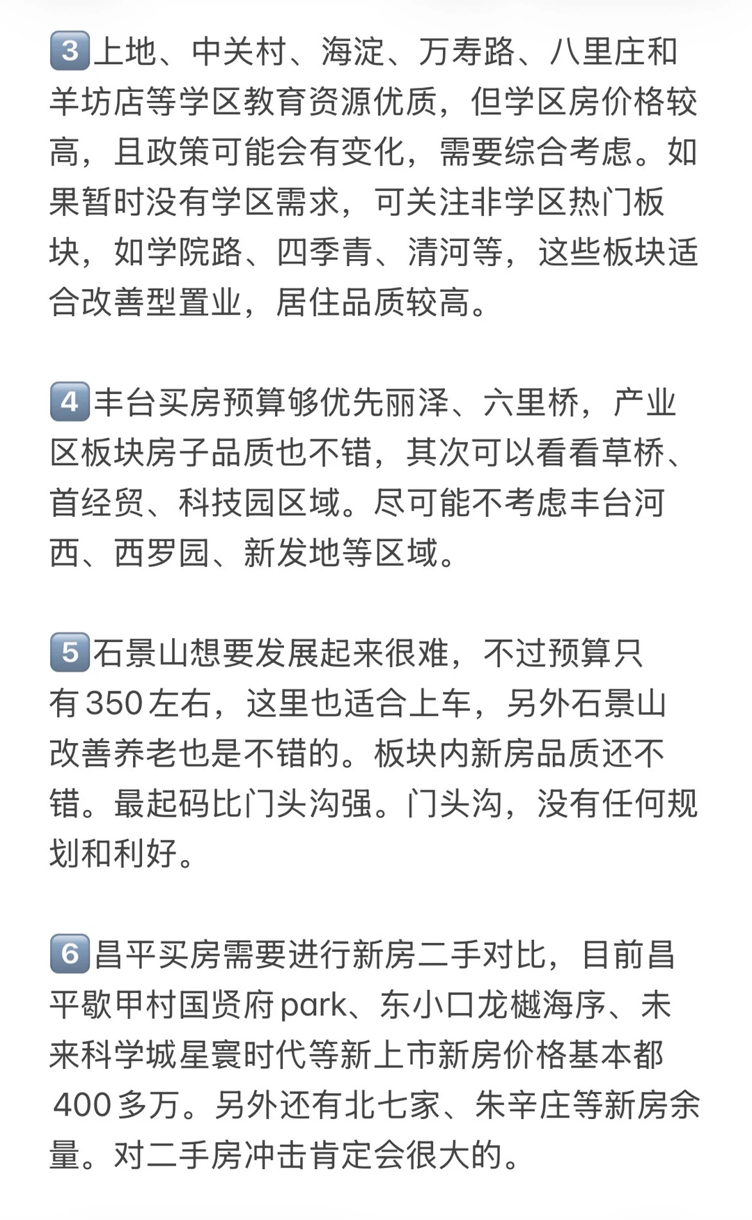 3️⃣上地、中关村、海淀、万寿路、八里庄和羊坊店等学区教育资源优质,但学区房价格较高,且政策可能会有变化,需要综合考虑。如果暂时没有学区需求,可关注非学区热门板块,如学院路、四季青、清河等,这些板块适合改善型置业,居住品质较高。