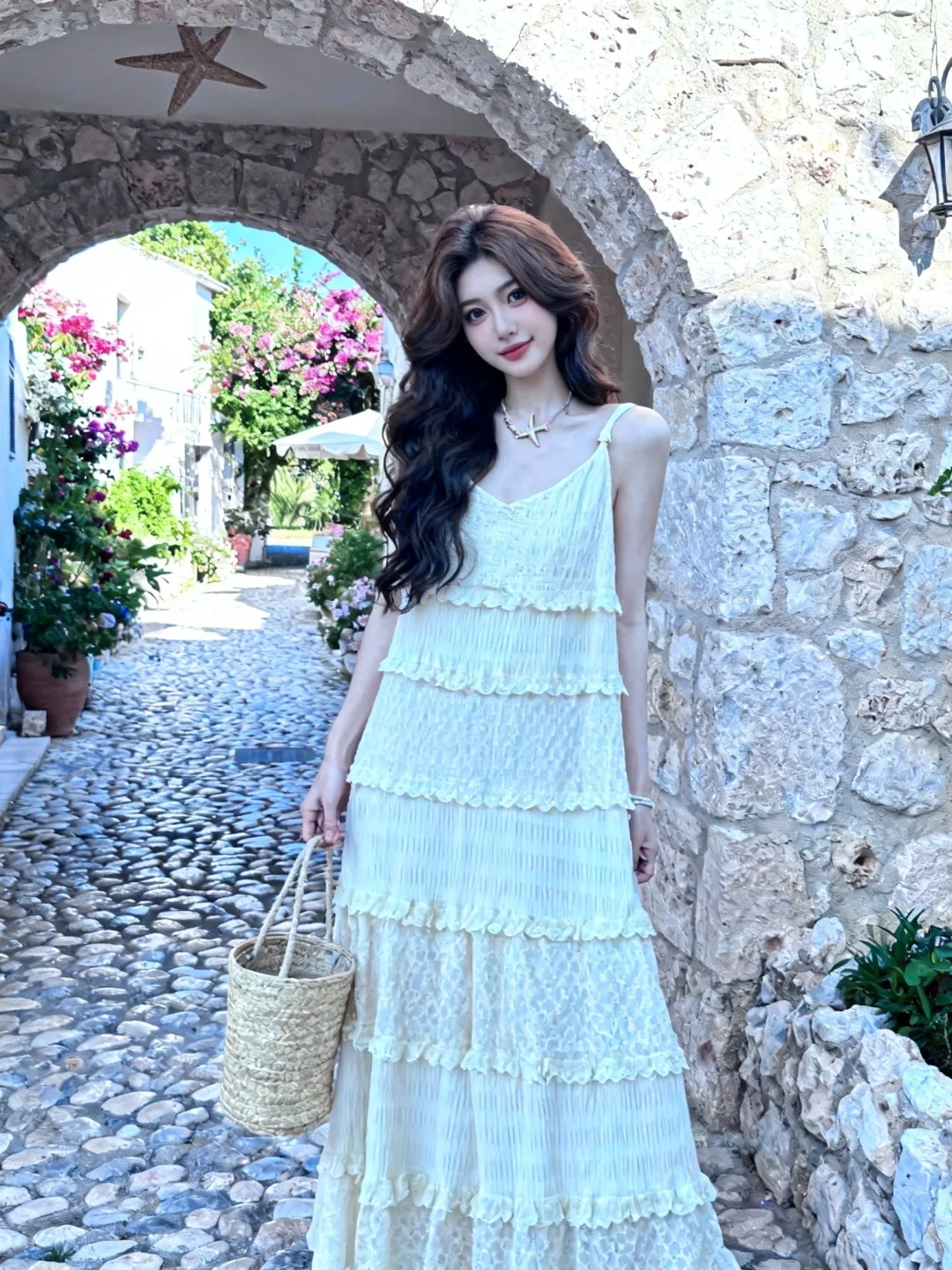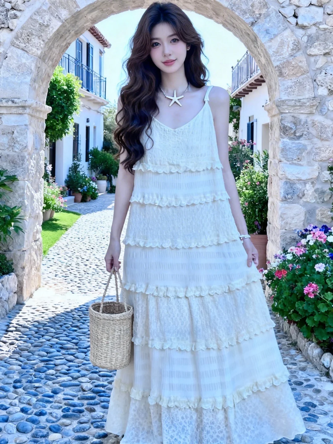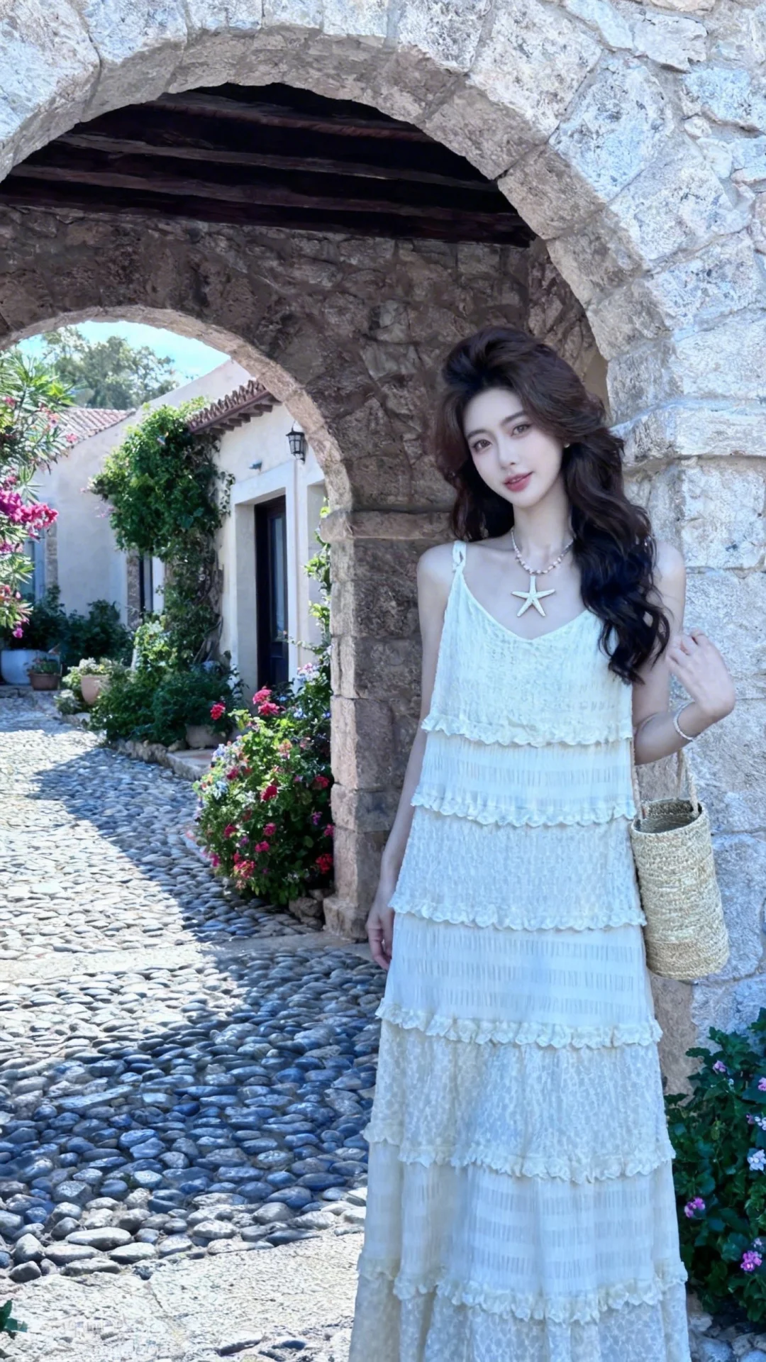 日常快照高质量网红人像,半身照,冷白皮,皮肤白净光滑,脸型精致鼻梁高挺,发丝清晰可见,浓颜系美女,轻甜御姐,深色瞳孔,表情灵动,得意,看着镜头,idol感,韩系风格少女,高颜值少女,深棕色长卷发,高颅顶,头包脸,头发显得松弛。法式复古奶油千层蛋糕裙,米白色,V领细吊带,多层荷叶边蛋糕裙摆,蕾丝拼接,压褶肌理感,宽松A字大摆,及地长款,草编水桶包,海星项链,站在南欧石砌拱门旁,阳光明媚的度假小镇庭院,鹅卵石路,绿植鲜花,温柔微笑,随机动作,绝美双眼,眼神慵懒且松弛却不失妩媚感,有着清晰下颌线,狭长眼,清新脱俗,极具女性魅力,冷色调、低饱和度,些微过曝,超低分辨率,网红构图且姿势率性随意。独树一帜的绝美外貌。构图有张力