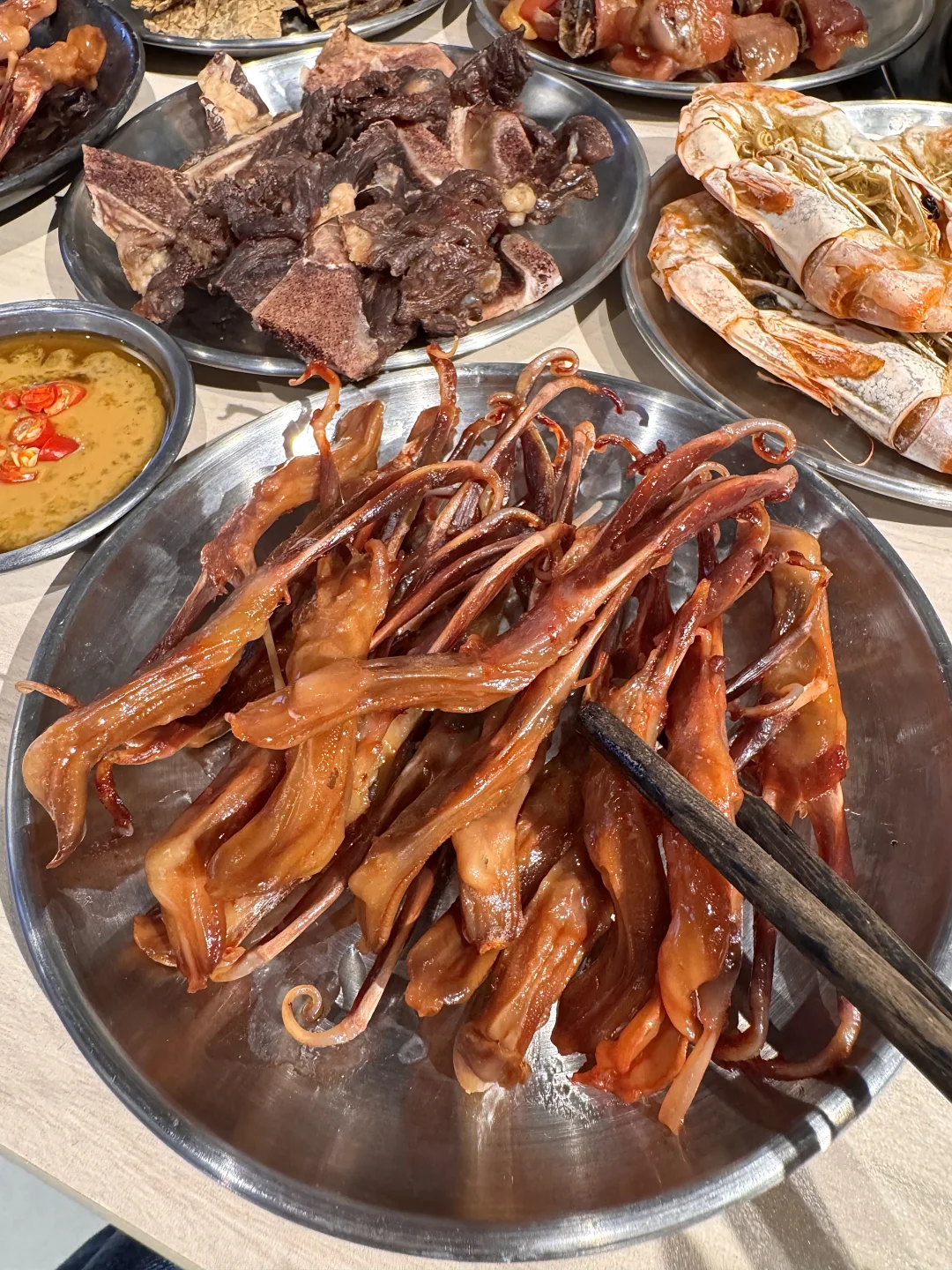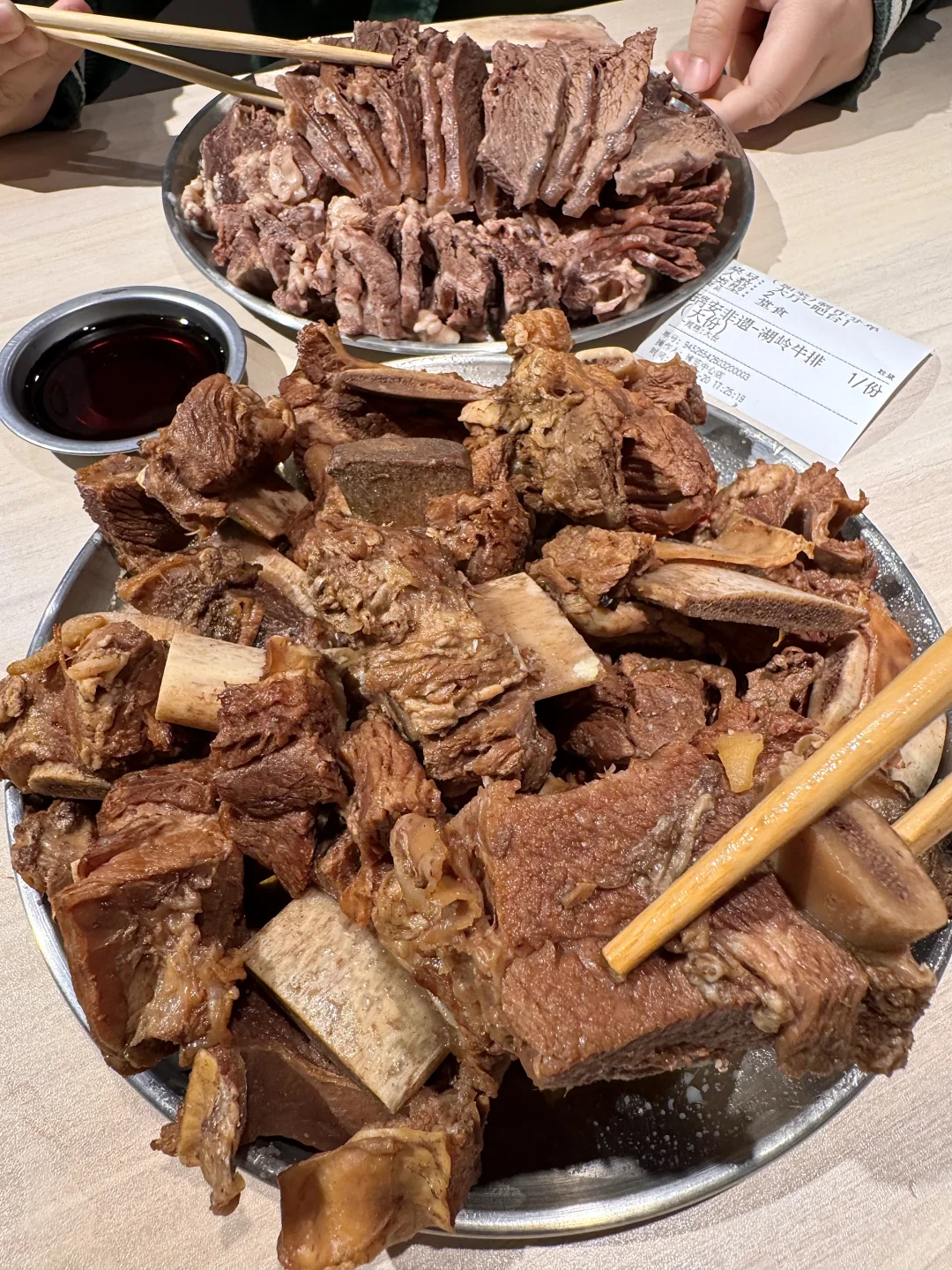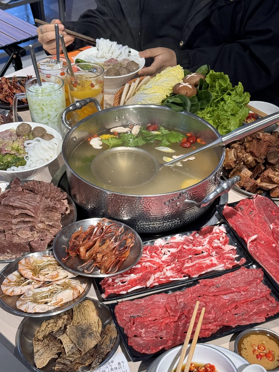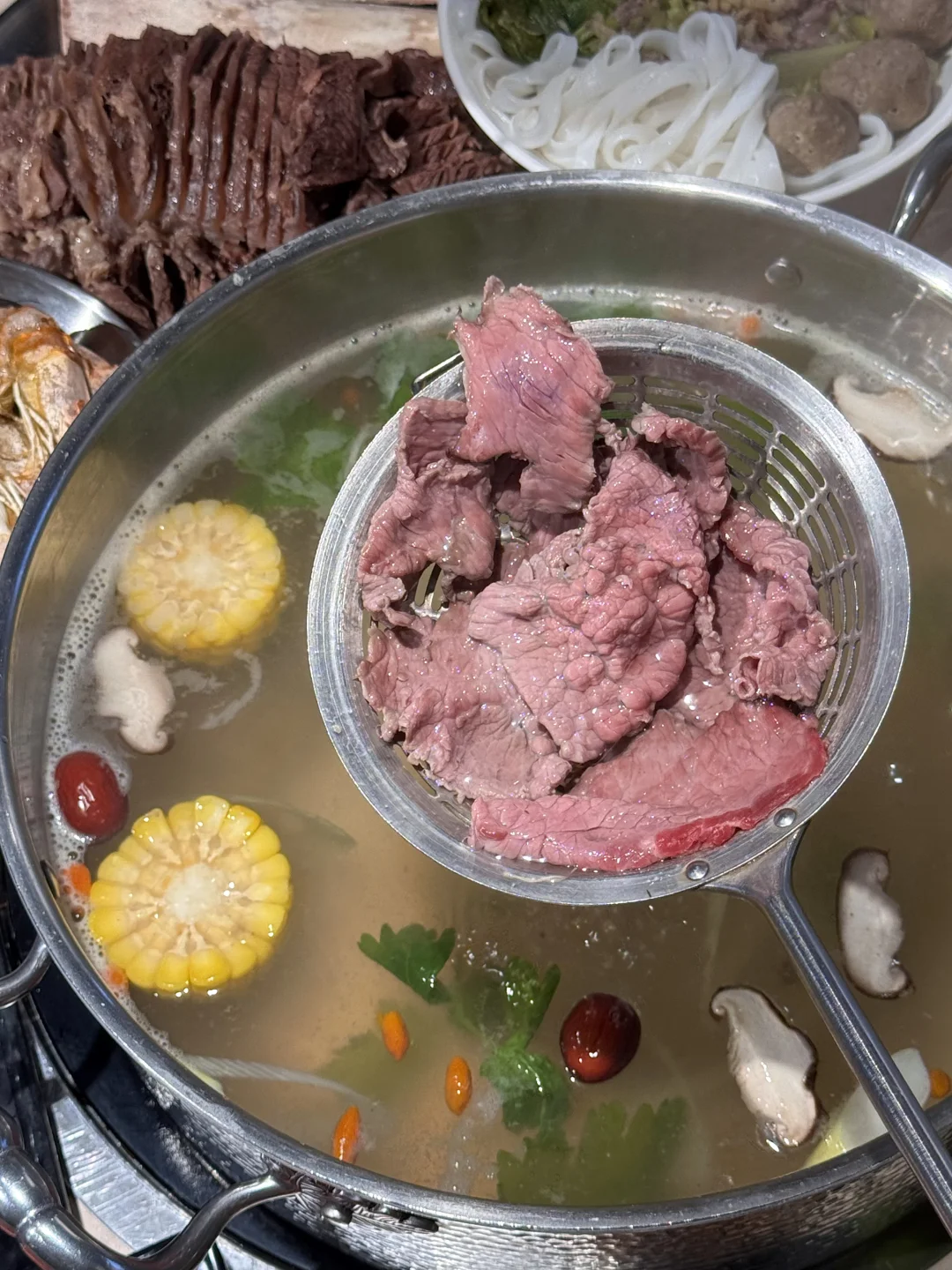 还有大块卤牛排!连筋带肉不管是空口吃还是蘸点辣子粗都很美妙!牛肉火锅也很新鲜!配杯冷饮来点沙茶酱和金蒜555 好吃到晕!叫:湖岭一头牛)