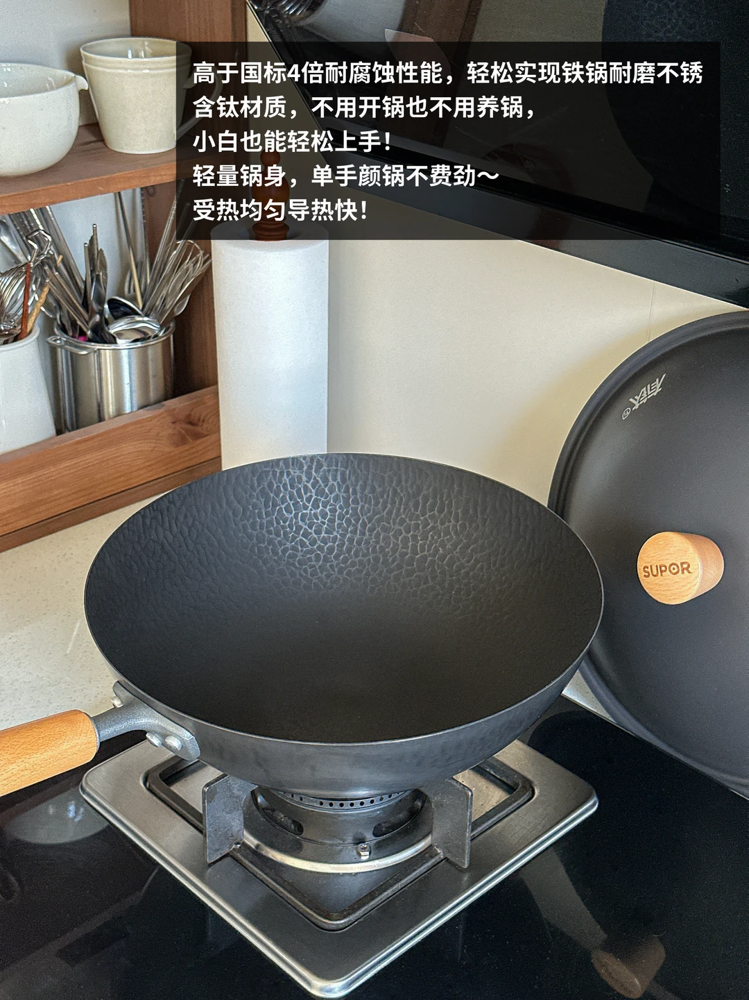 做饭最受不了的就是粘锅,这款是通过等离子钛铁不粘技术。还有它高于国标4倍耐腐蚀性能,轻松实现铁锅耐磨不锈!