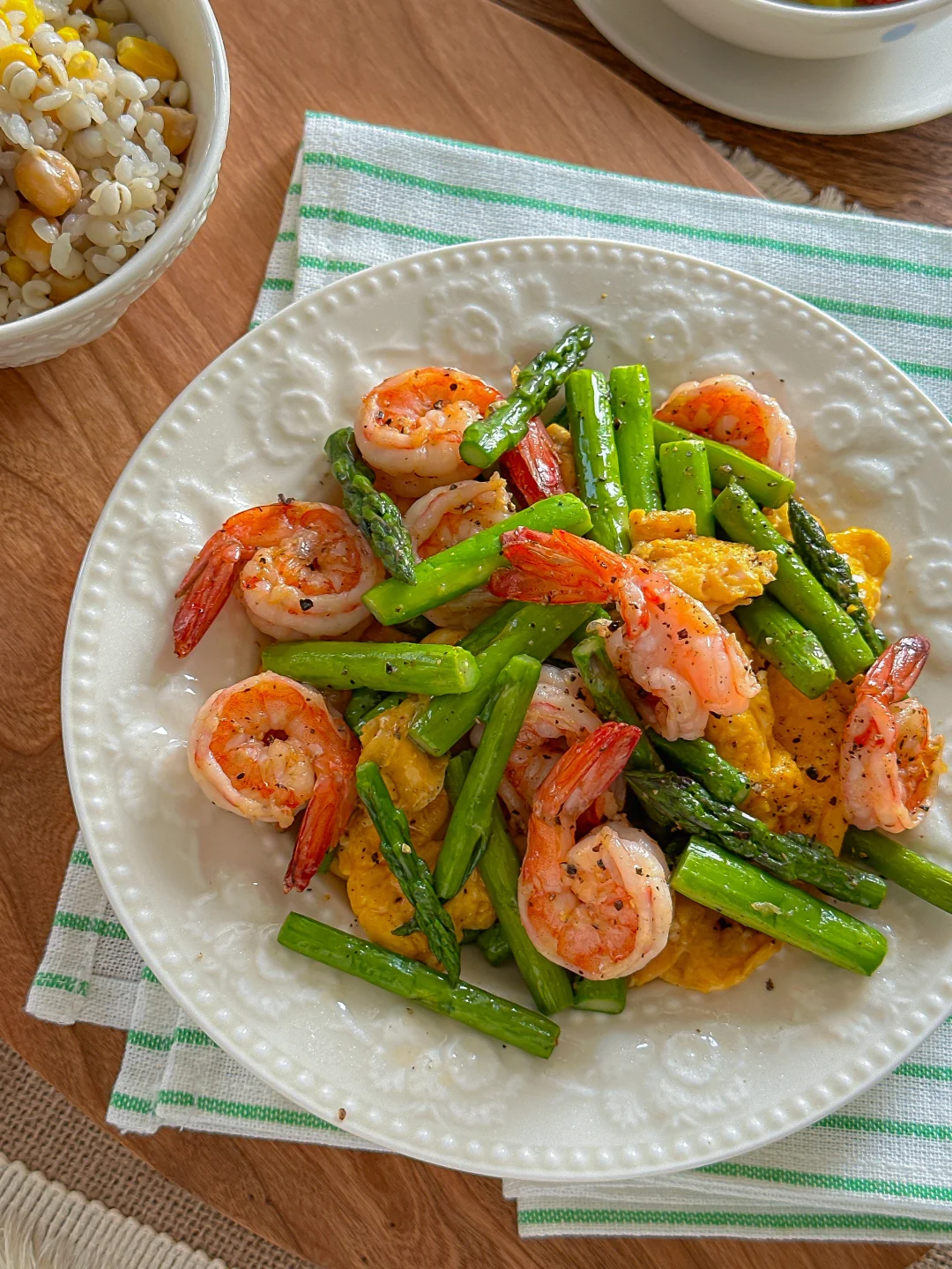 芦笋有独特的清甜口感 ,搭配虾仁有恰到好处的鲜美。 调味料只用了黑胡椒和盐 ,鸡蛋加少许🥛再滑, 软软嫩嫩的实在是香!