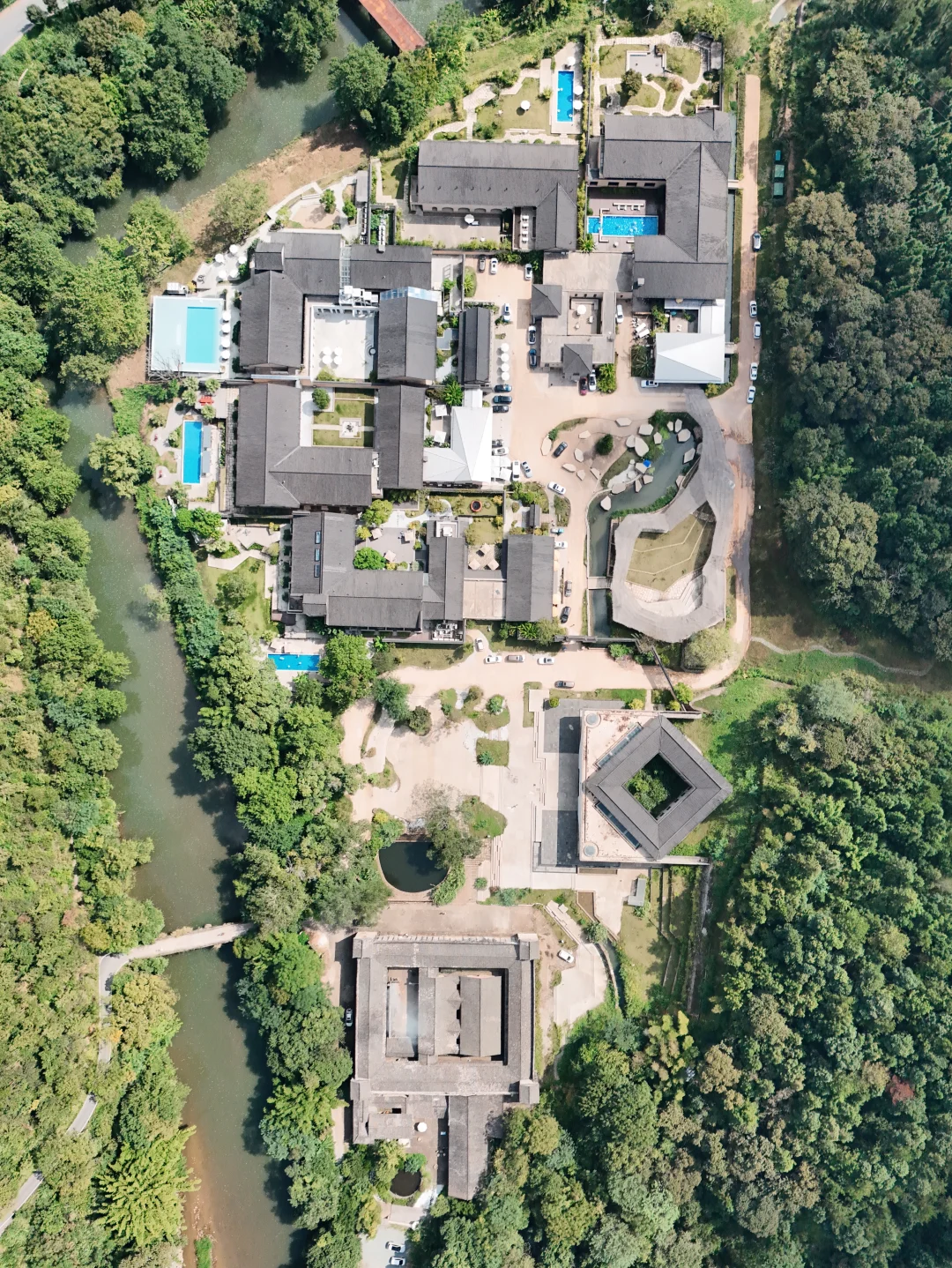 天圆地方围屋,航拍视角下,它是一枚落在大地上的太极印章。门口还有一颗巨树,特别好看🌲