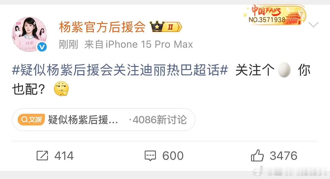 杨紫后援会回应:关注个🥚,你也配?不过评论区暂时没买账疑似杨紫后援会关注迪丽热