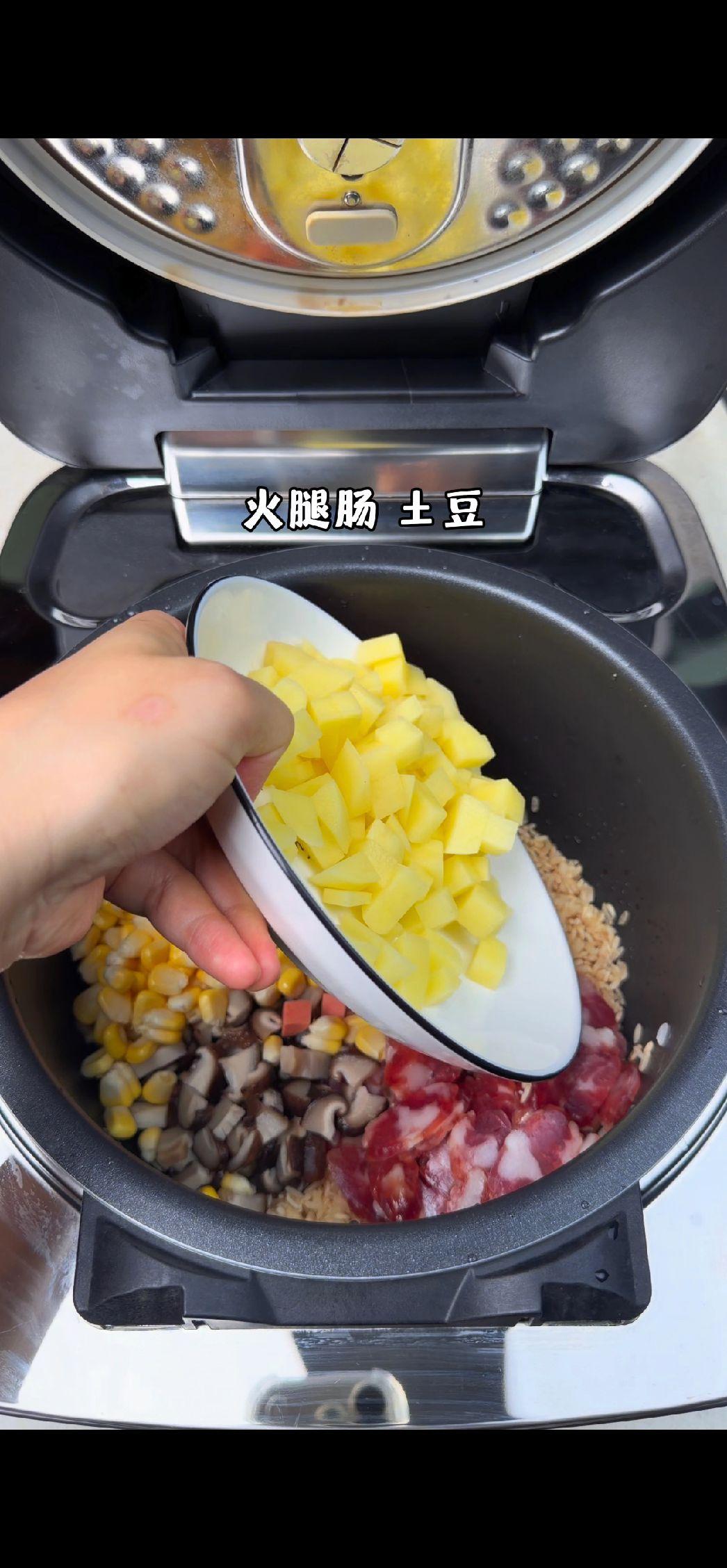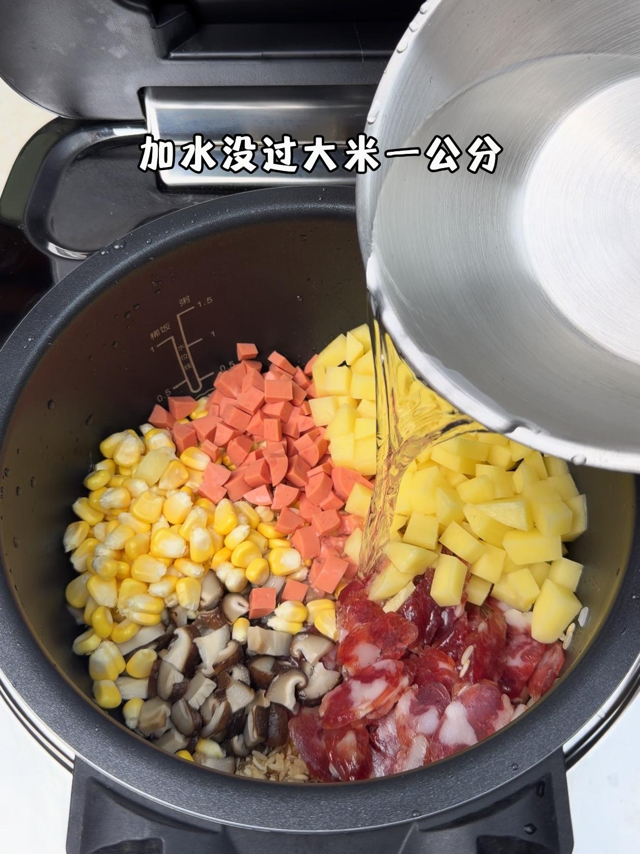 1️⃣准备食材:大米洗净,香肠、香菇、玉米、火腿肠、豌豆备好。 2️⃣调味拌匀: