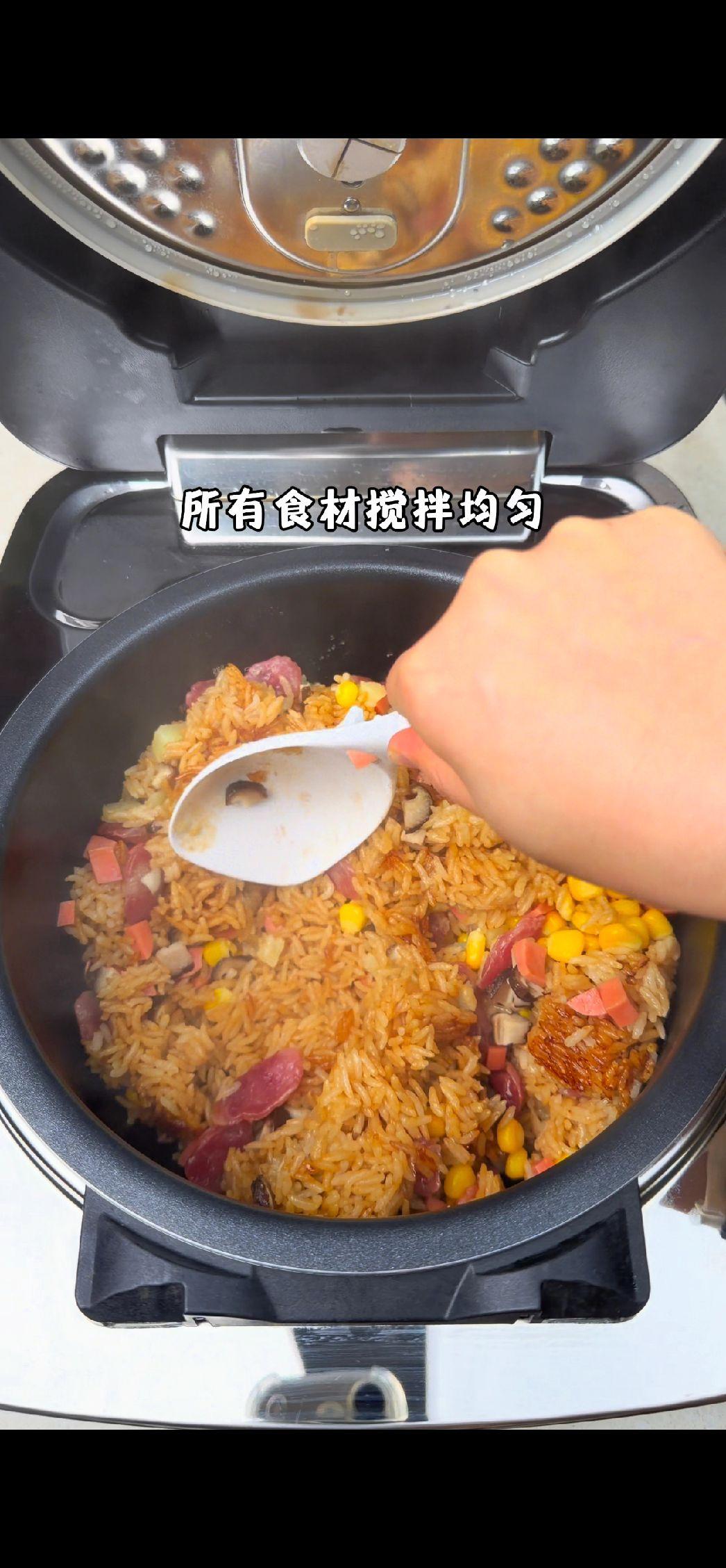 3️⃣焖饭出锅:食材倒入,按煮饭键;开盖后翻拌均匀,满屋飘香,有饭有菜鲜香软糯。