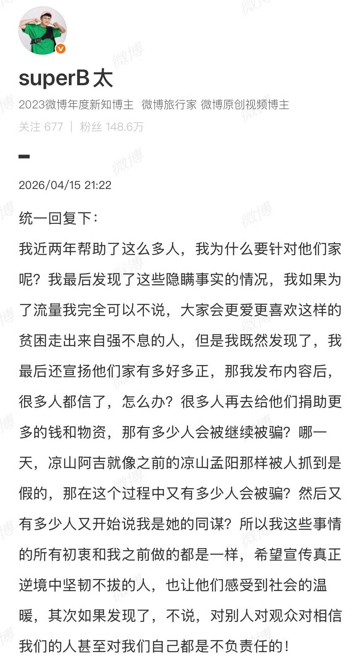 事件发酵后,曾长期为阿吉提供资金、生活用品与房屋改造帮扶的百万网红“澳门老炮”,于4月14日正式发布声明,因阿吉虚构困境、消费善意的言行,宣布永久终止对其家庭的一切资助,不再提供任何物资与资金支持。随后,B太回应称,自己并非为流量发声,而是不愿更多爱心人士被欺骗,同时希望公众理性看待,给当事人改正的机会。目前,当地相关部门已介入调查,该事件持续引发网友对网红公益真实性、山区帮扶核查机制的热议,不少人感慨善意被利用,寒了真心助人者的心。百万网红称取消对骗b太大山女孩资助