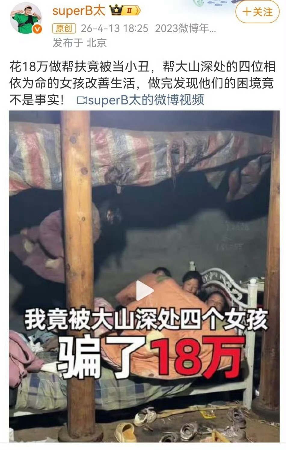 近日,B太公开曝光帮扶骗局,称其投入18万元为凉山女孩阿吉一家建房改善生活,却发现对方刻意虚构家庭困境:谎称自己是孤女独自抚养三个妹妹、哥哥去世、父亲丧失劳动能力,实则父亲身体健康、常年打牌,家中兄长与弟弟均在世,真实家境与卖惨人设严重不符。百万网红称取消对骗B太大山女孩资助B太回应曝光大山女孩事件