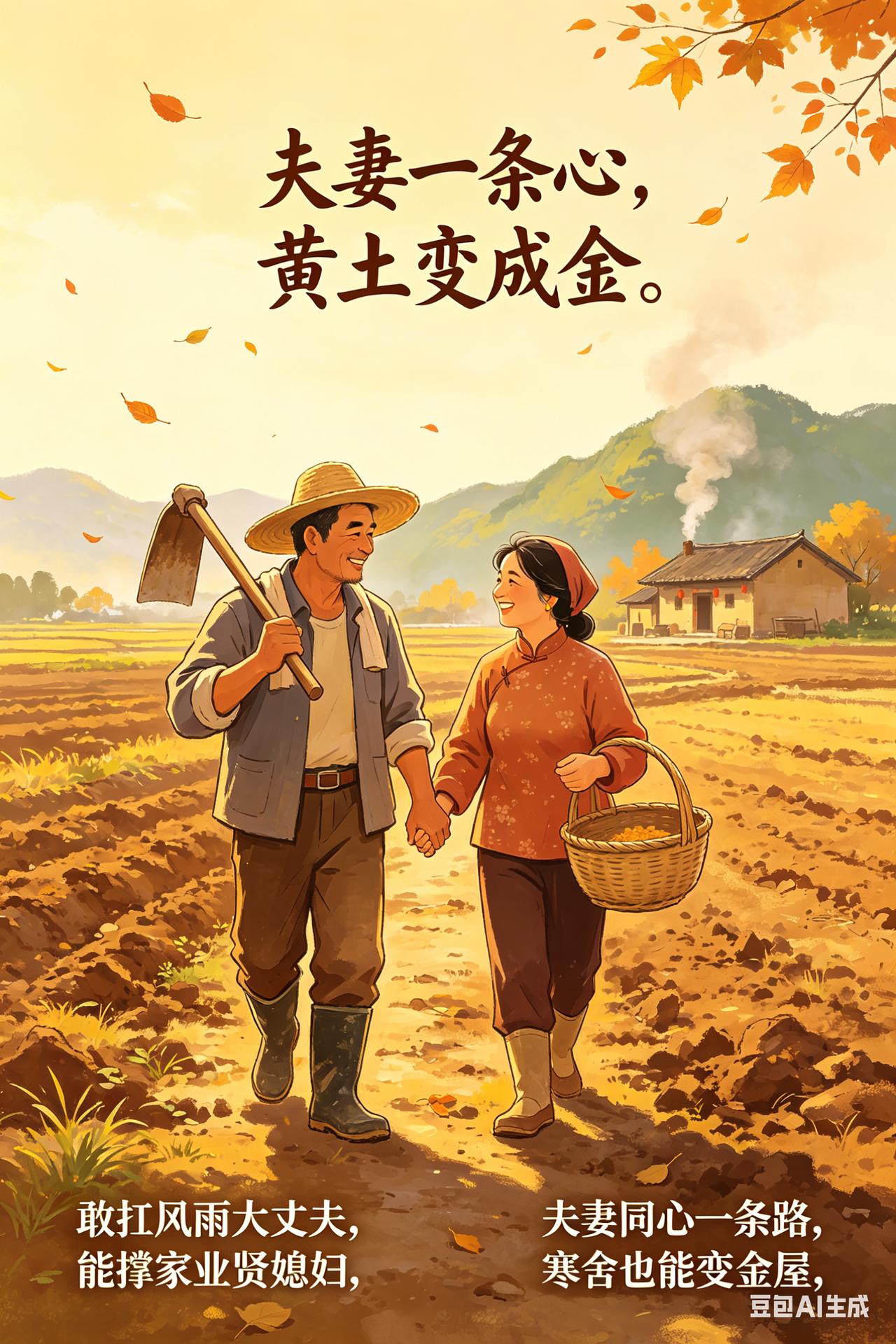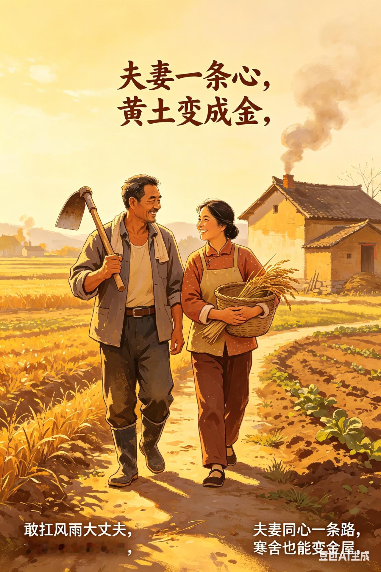 夫妻一条心,黄土变成金 敢扛风雨大丈夫, 能撑家业贤媳妇。 夫妻同心一条路,