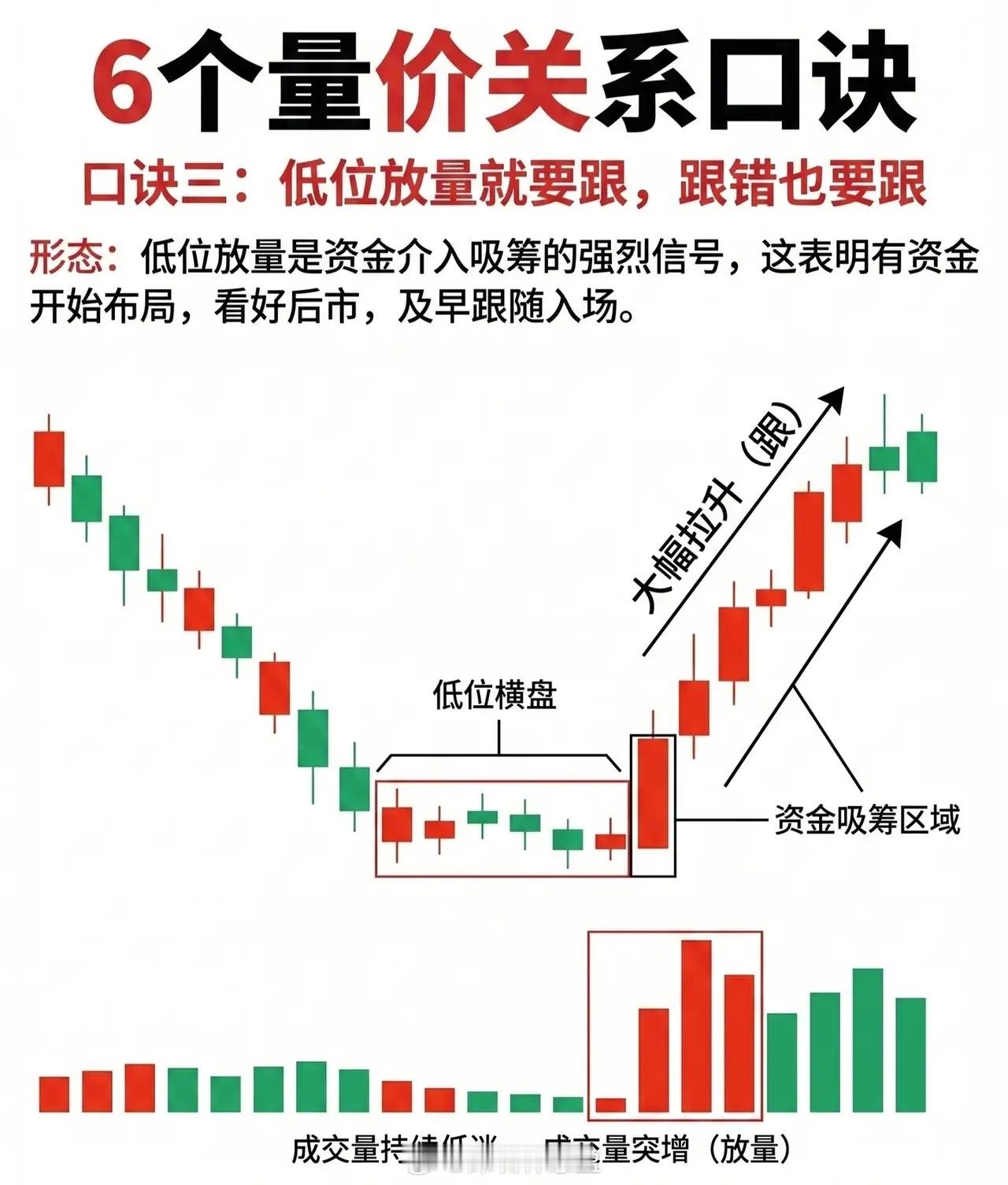 形态解析:股价处于低位区域时,若出现放量(成交量突然大幅放大,突破前期低迷水平),则是资金介入吸筹的强烈信号。