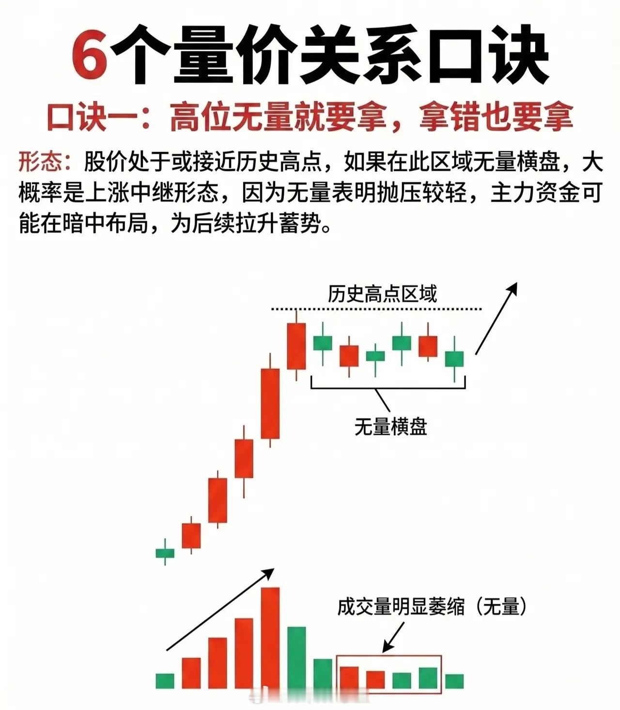 形态解析:当股价处于或接近历史高点区域时,若在此区间呈现无量横盘态势(成交量显著萎缩),则大概率属于上涨中继形态。