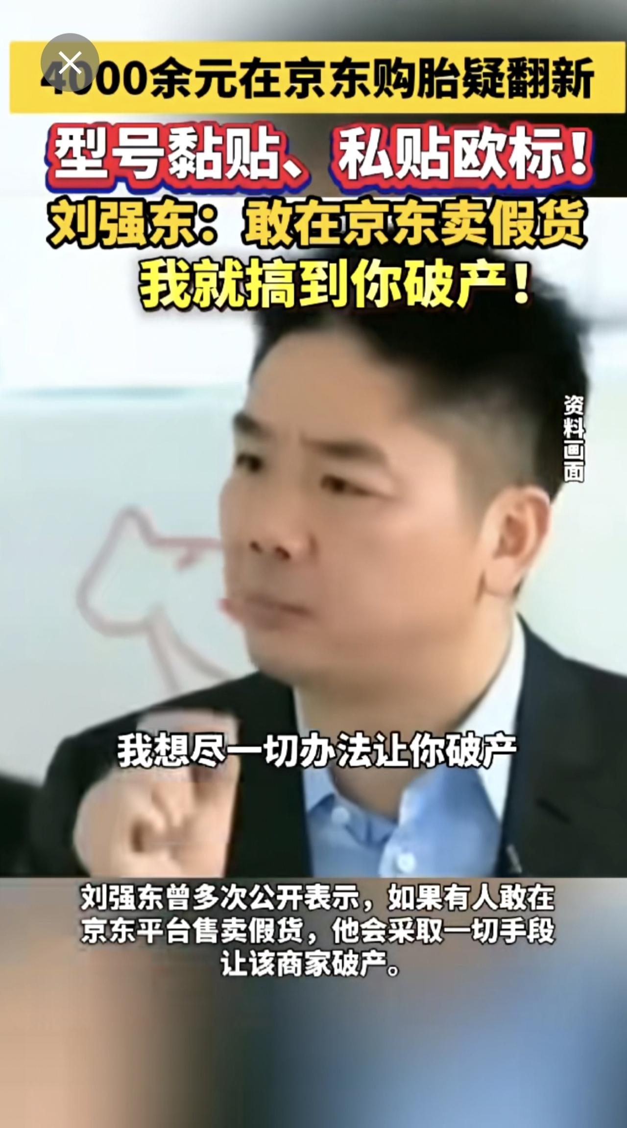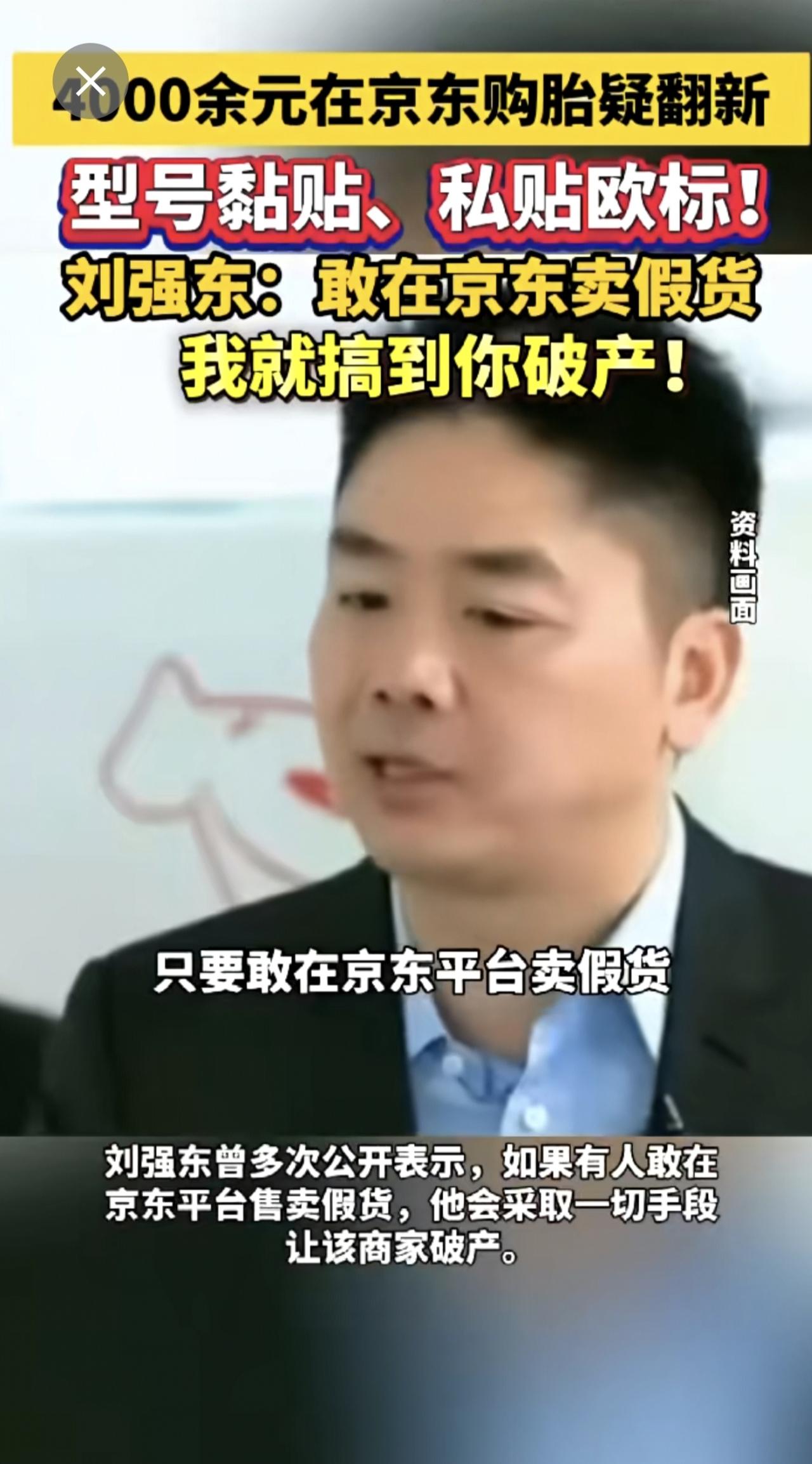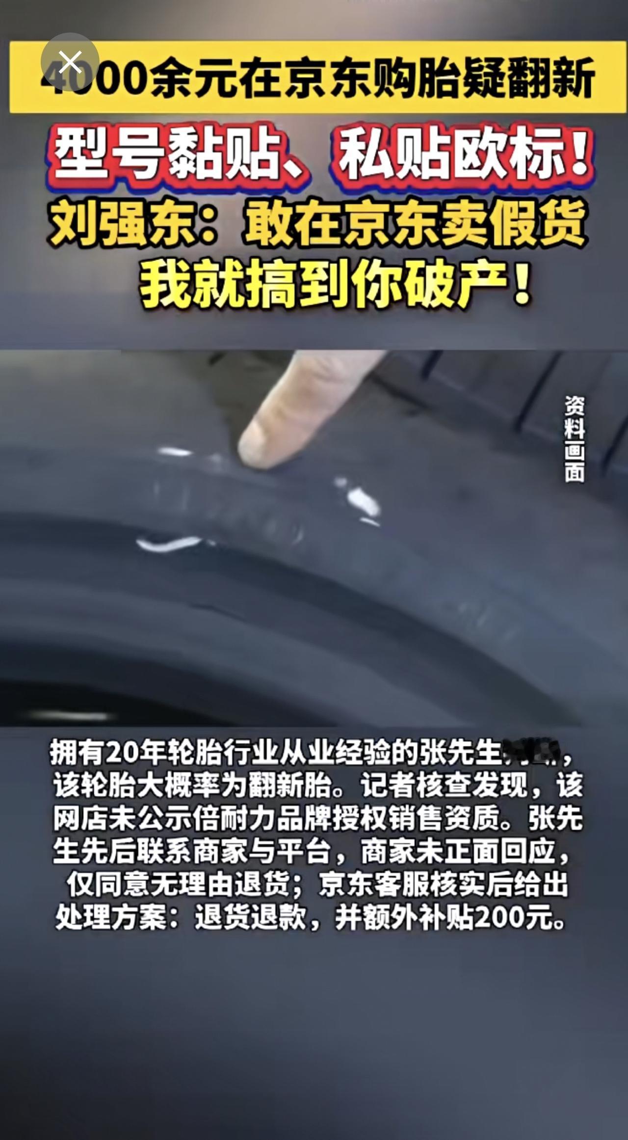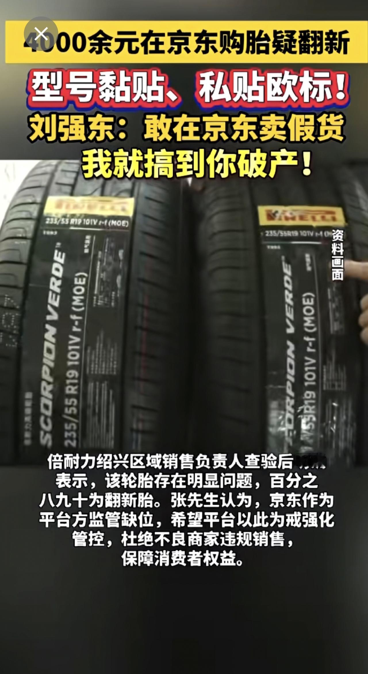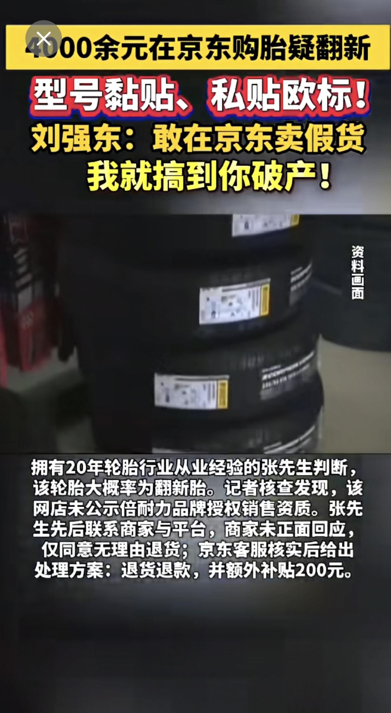 4000余元在京东购胎疑翻新 型号黏贴、私贴欧标! 刘强东:敢在京东卖假货 我就搞到你破产!