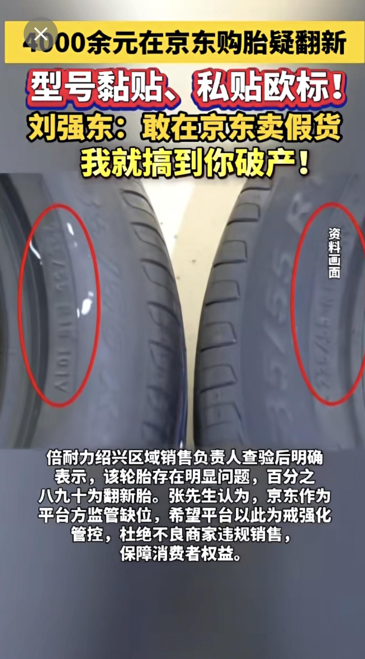 4000余元在京东购胎疑翻新 型号黏贴、私贴欧标! 刘强东:敢在京东卖假货