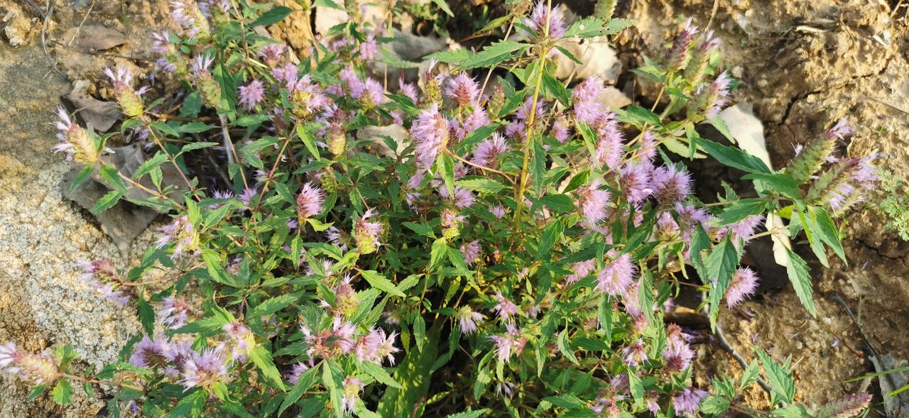 在万物开始凋零的初冬时节,香薷花却以它那艳丽的姿态傲然挺立。它的花朵小巧玲珑,呈淡紫色或紫红色,如同一个个精致的小铃铛,在微风中轻轻摇曳。那一串串花朵紧密地排列在茎上,形成了一条条美丽的花穗,远远望去,就像天边一抹绚丽的云霞。