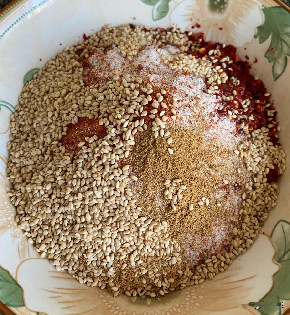 1️⃣辣椒面组合:二荆条辣椒面(约100克,主要负责香)、子弹头辣椒面(约120克,负责辣)、秦椒细面(约25克,负责红亮颜色)。混合后加一小勺盐和炒熟的白芝麻。