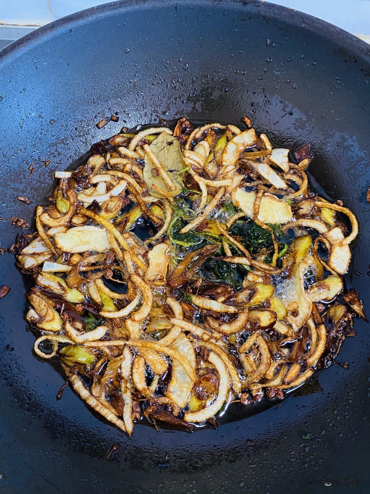 ②凉油状态下,把所有香料和蔬菜料全放进去,开最小火慢慢炸。一定要有耐心!炸到锅里泡泡变少,葱和洋葱都变成焦黄色,关火。