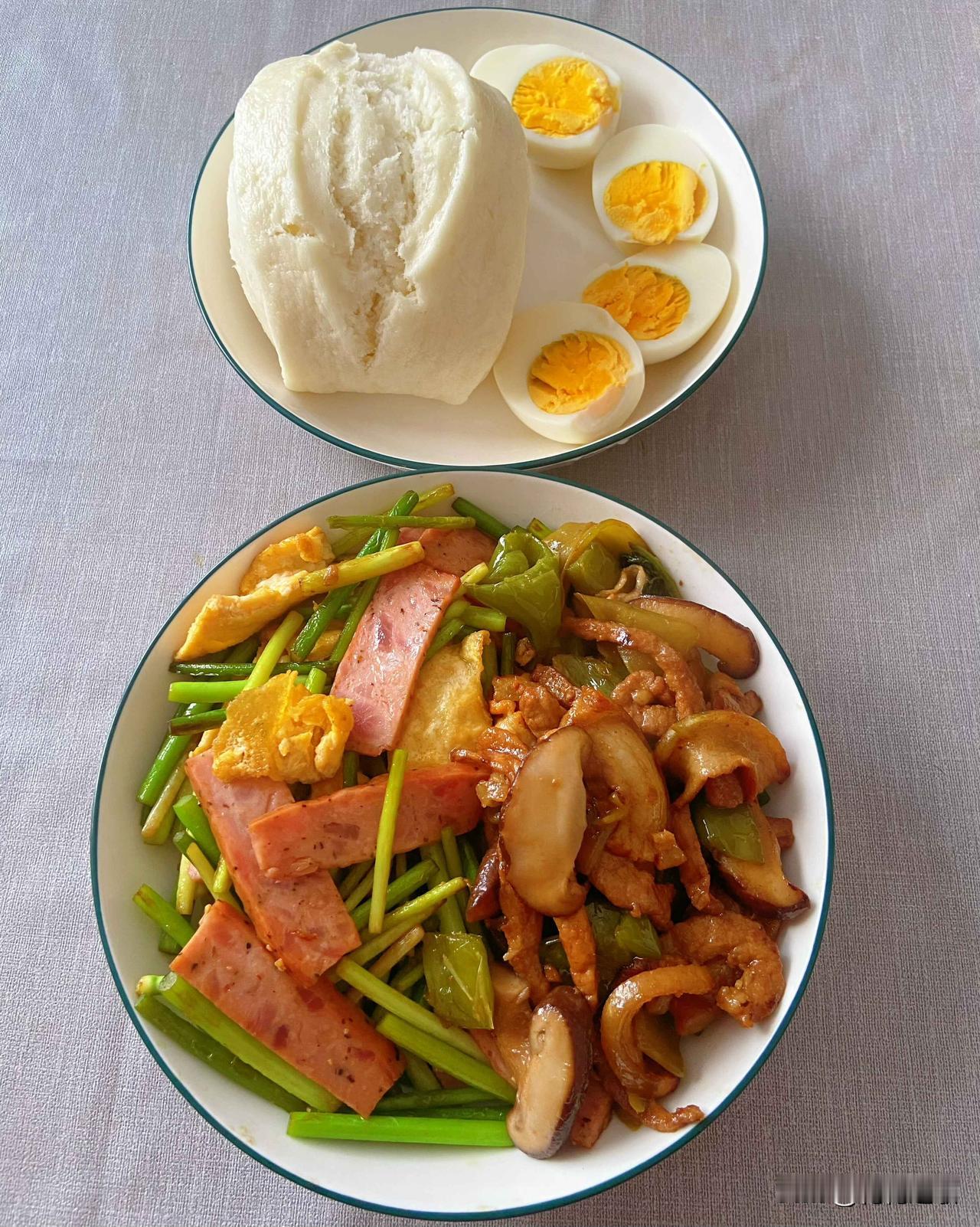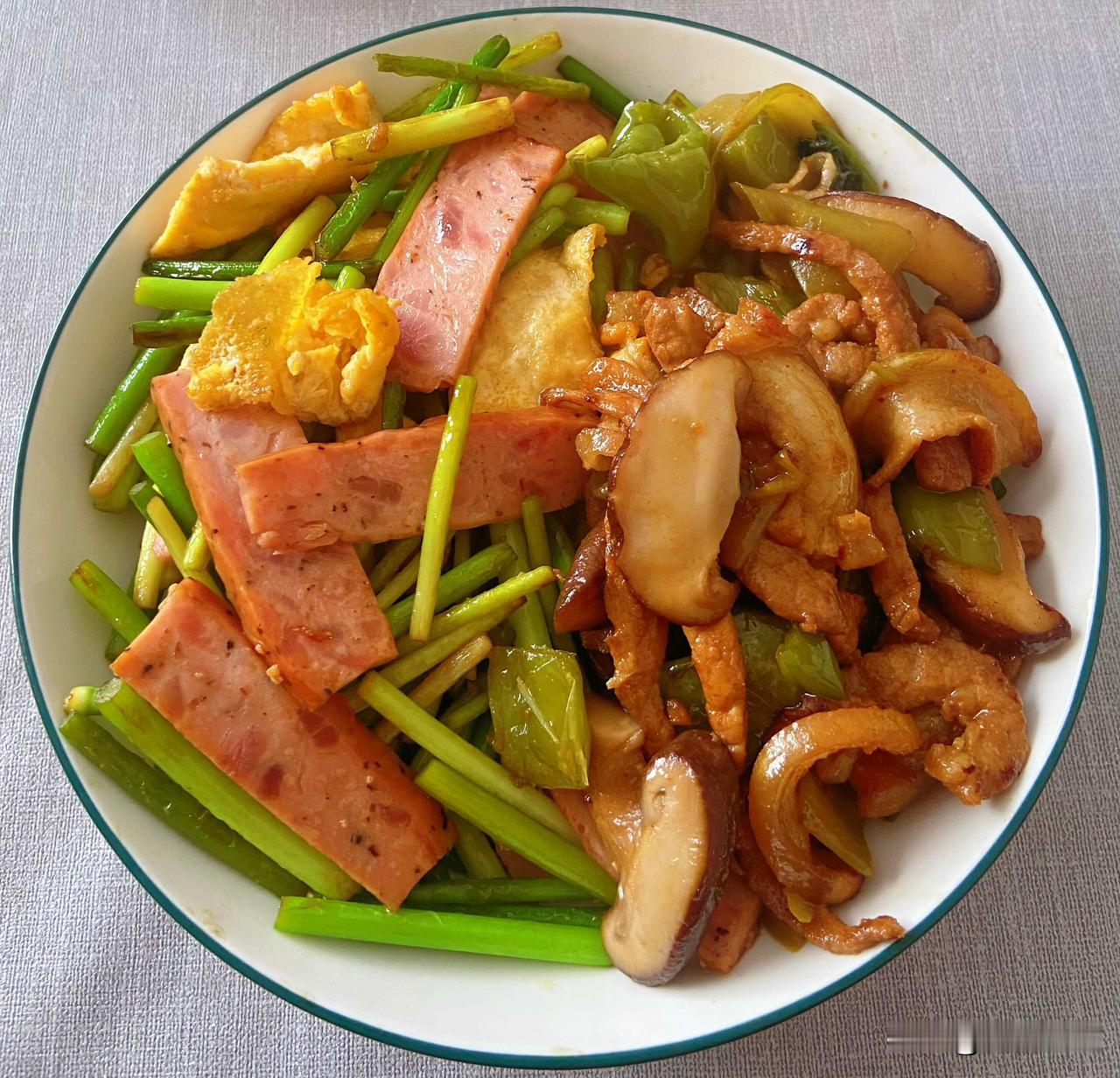 主菜:杂烩拼盘(蒜苔火腿炒鸡蛋一个,再来一个莴笋青椒香菇肉,混着也行[笑哭])