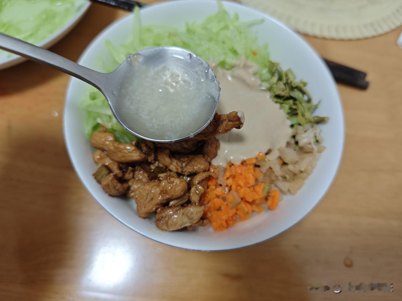 比如今晚这凉面,要是只有肉丝、黄瓜丝、香椿末、咸菜末、麻汁,绝对出不来那种感觉,必须要有蒜汁,蒜汁绝对是灵魂!