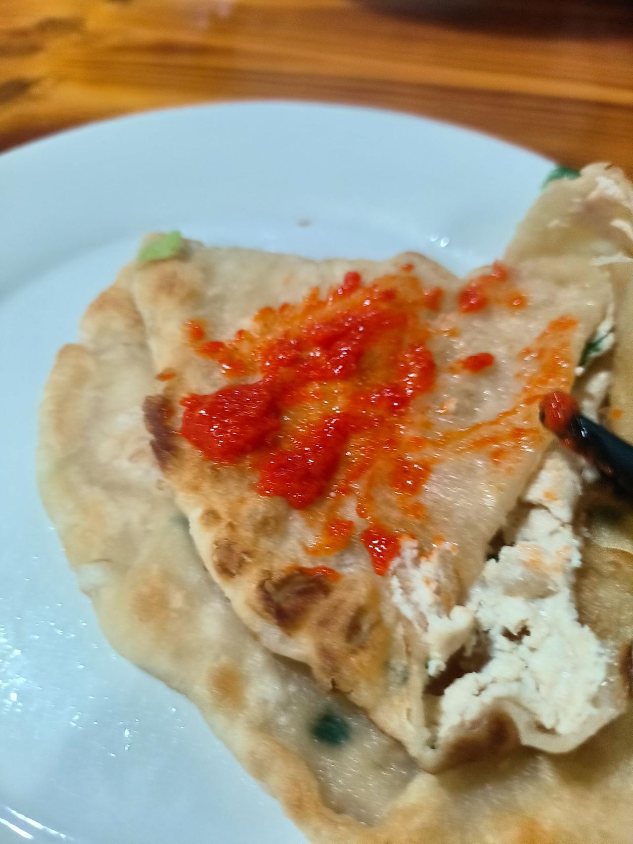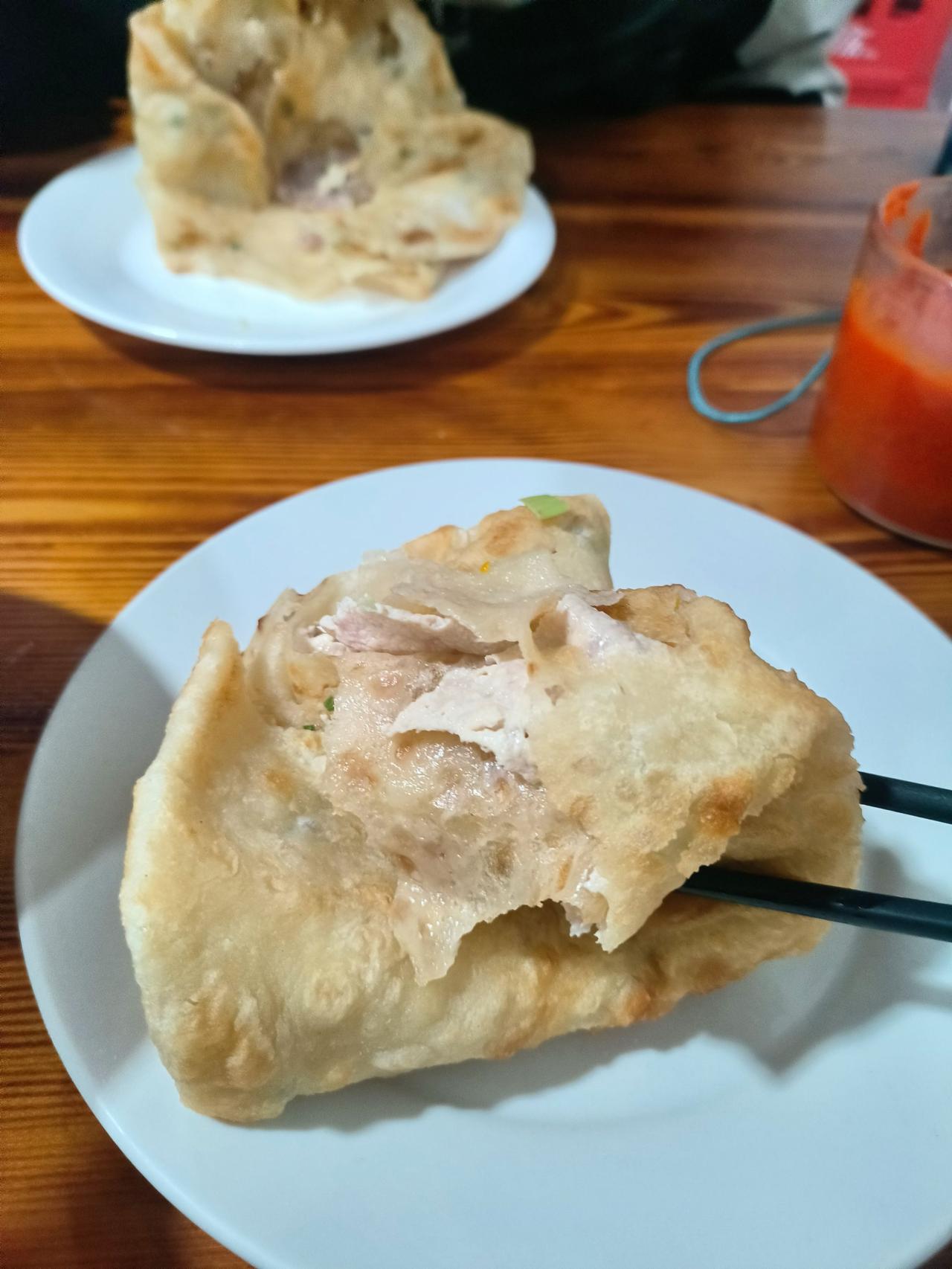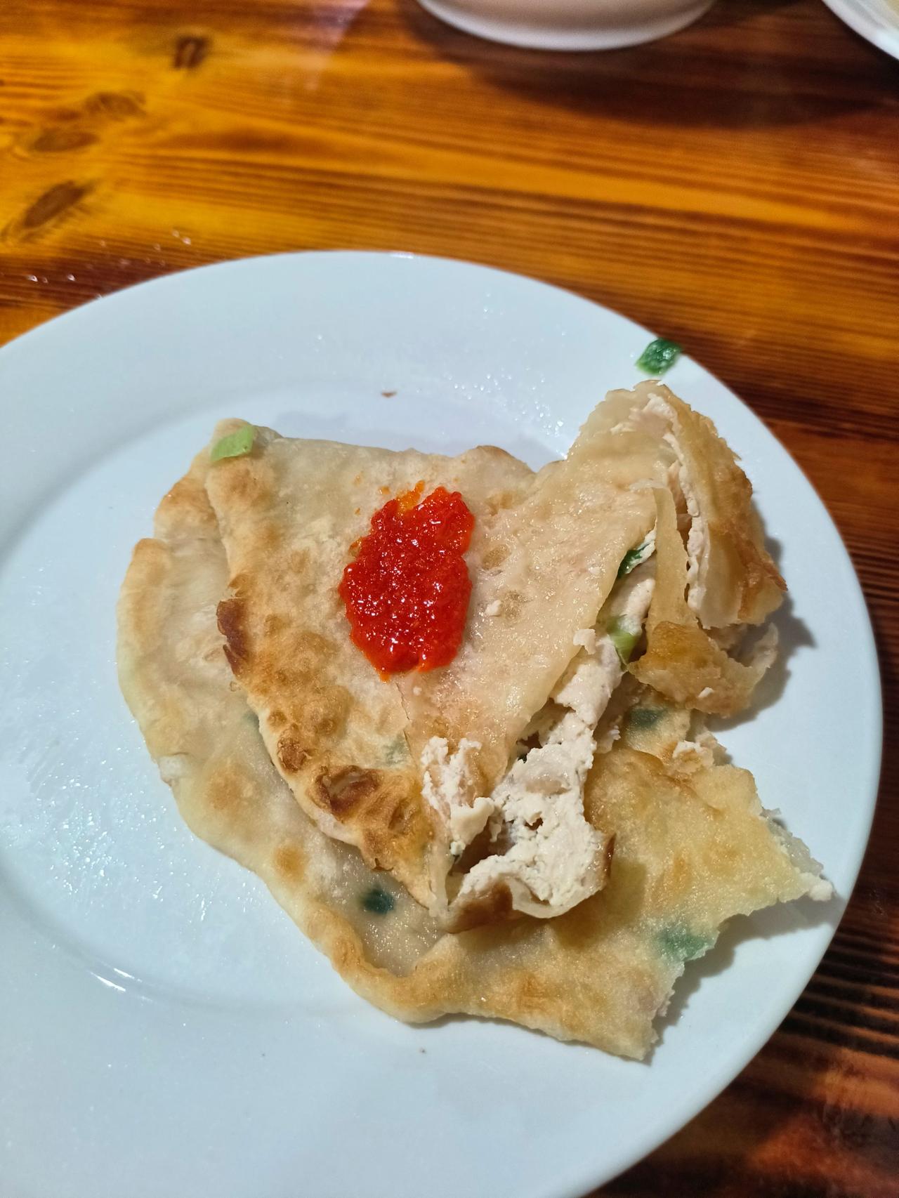 浦江的麦饼果然是名不虚传,很好吃。孩子要的是全肉的,我要的是豆腐肉的,个人感觉豆腐肉更好吃,不腻,清香,肉也非常新鲜,味道是最简单的咸鲜味,然后加点味精。而且豆腐还吸走了肉的一部分油,使得豆腐一点也不寡淡。另外饼皮主要是软韧为主,稍微带一点点酥。后来觉得稍微有点过于清淡,又放了一点辣椒酱,那就更香了。