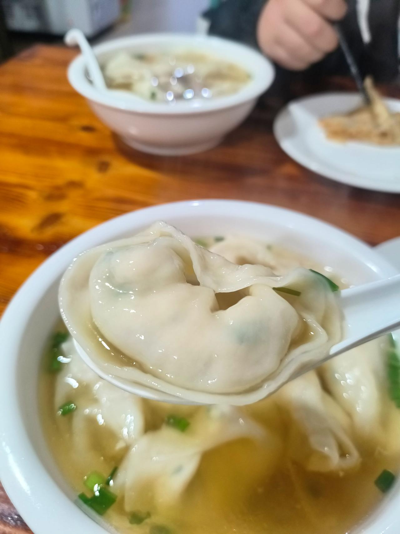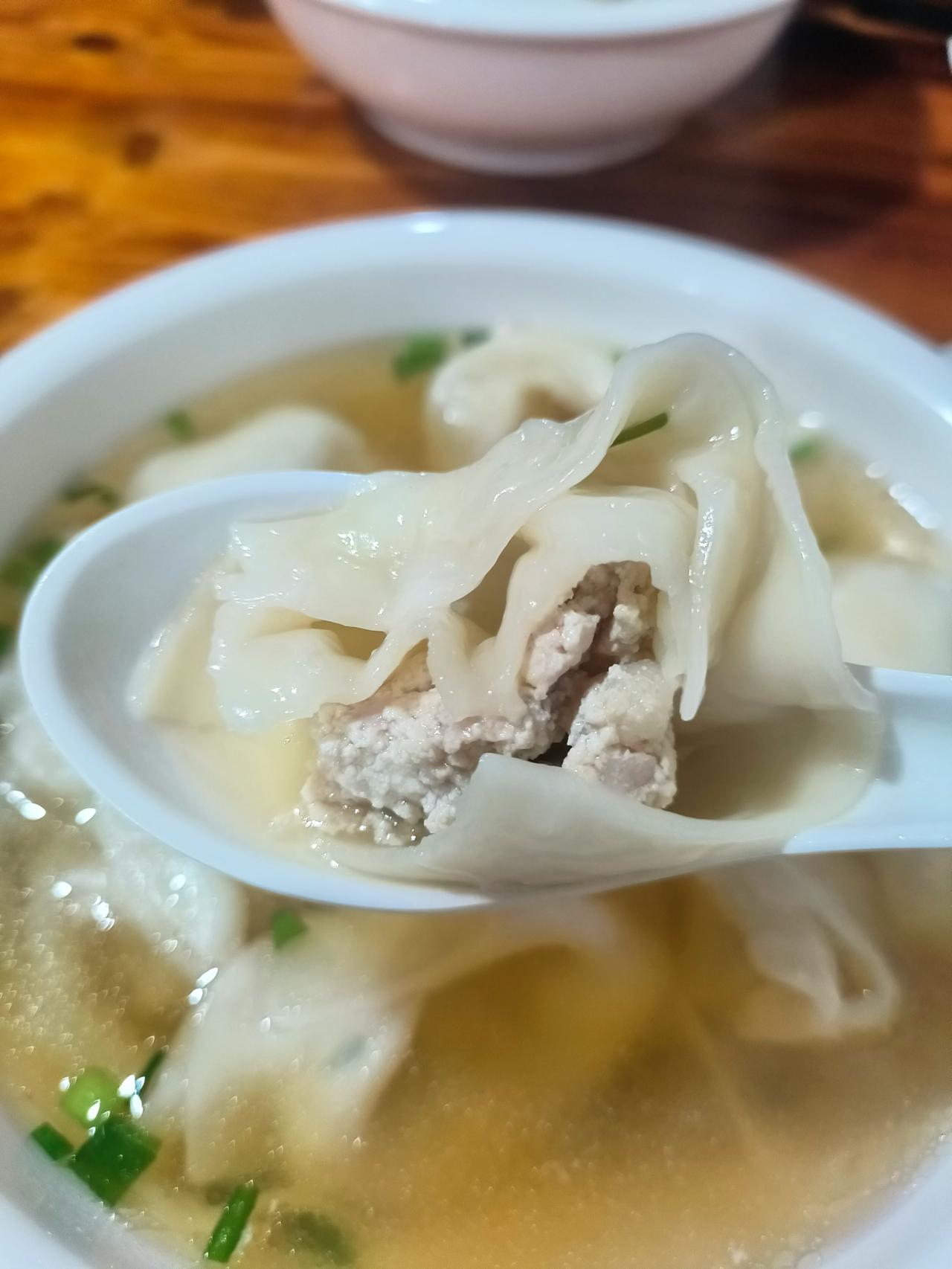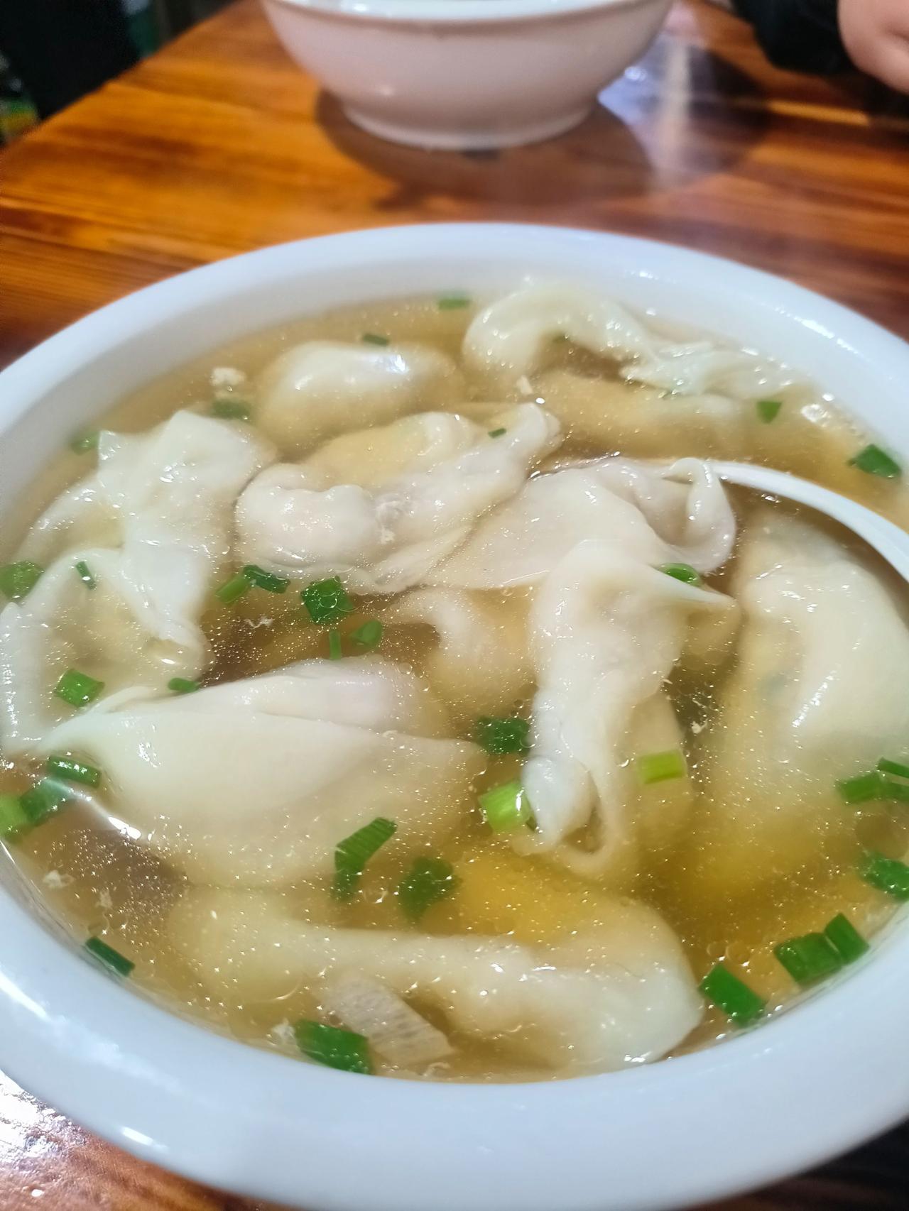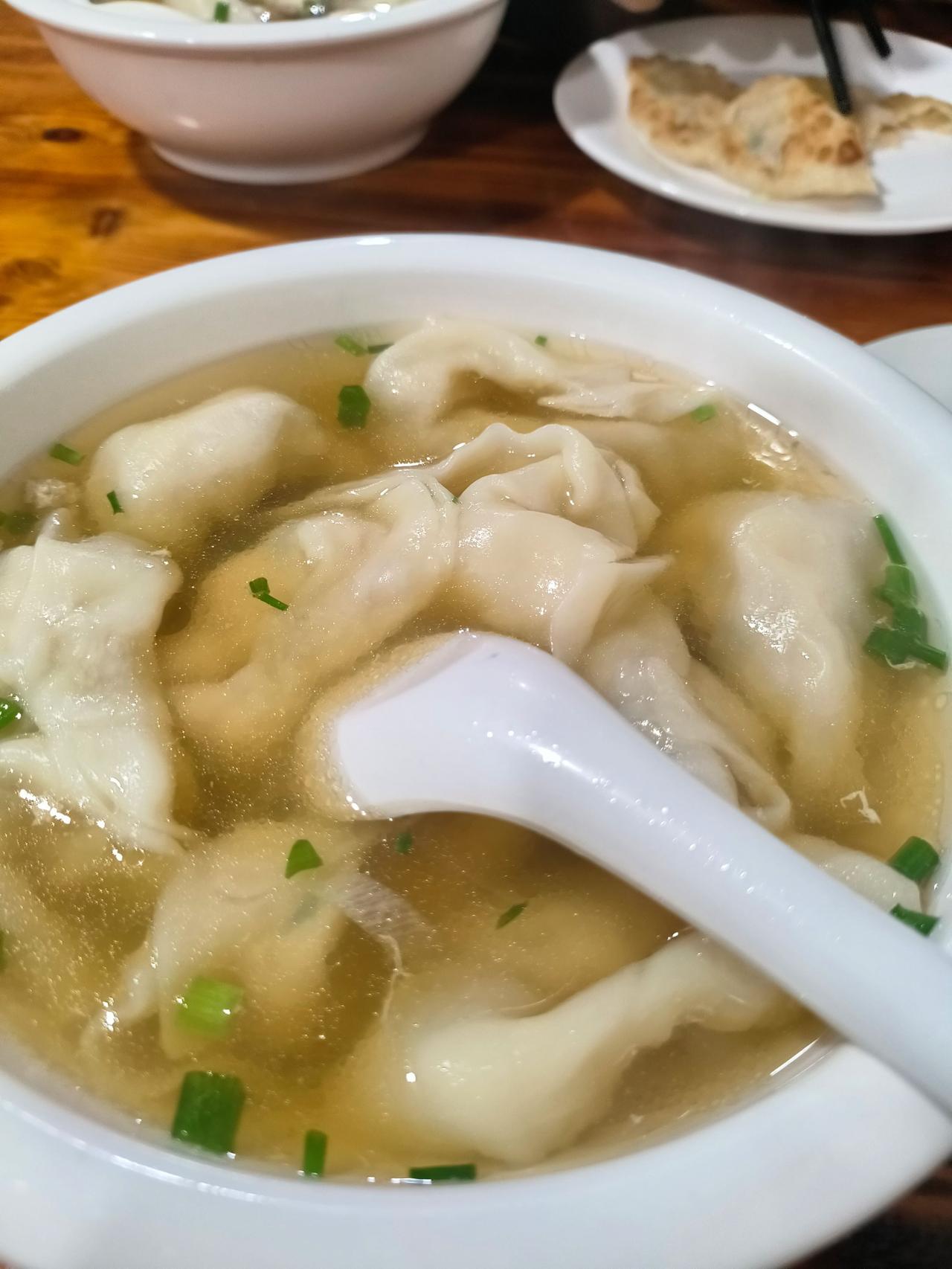 馄饨也不错,汤底就是普通的酱油汤,然后每一个馄饨个头巨大。基本上三口才能吃完。馄饨馅也是豆腐肉的,也是非常清淡,非常鲜,但是相比来说馄饨的魅力还是不如麦饼。