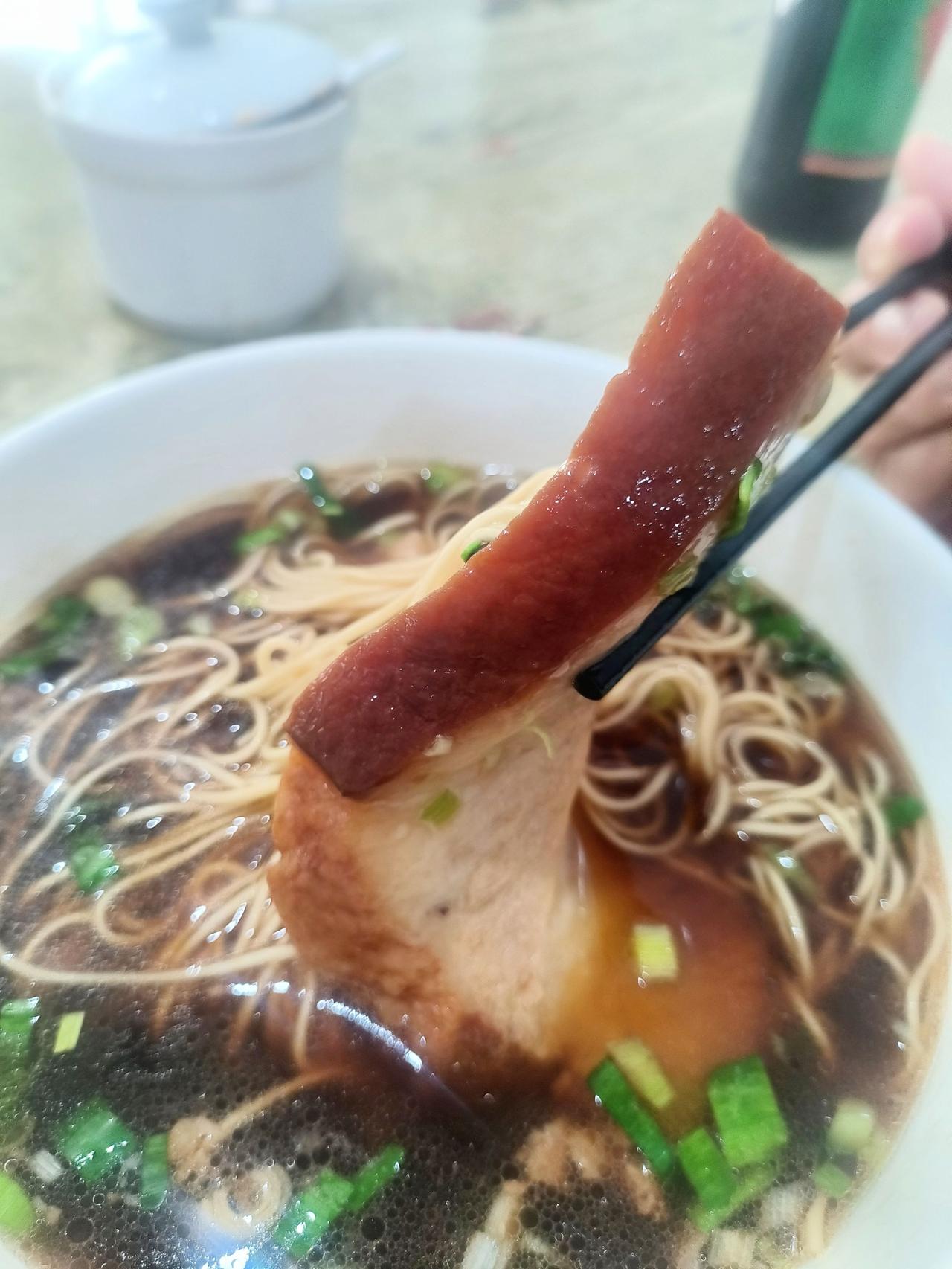 最后就是焖肉了,忘了这碗是13还是14,但是这块焖肉绝对分量十足,你看他这个宽度,基本上在1.5cm左右,很扎实。而且肥肉不腻,瘦肉酥烂化渣,酱香味又很足,如果不是减肥,不能多吃肥肉和面,真想再续一块,唉,减肥苦啊。