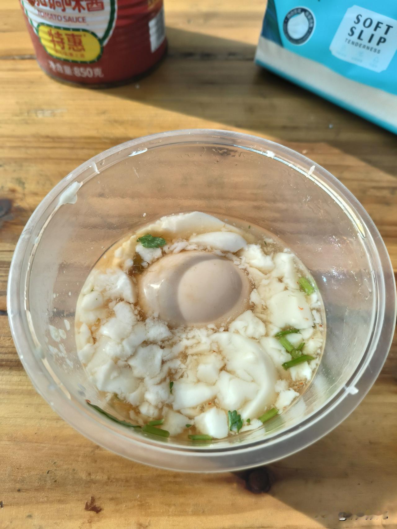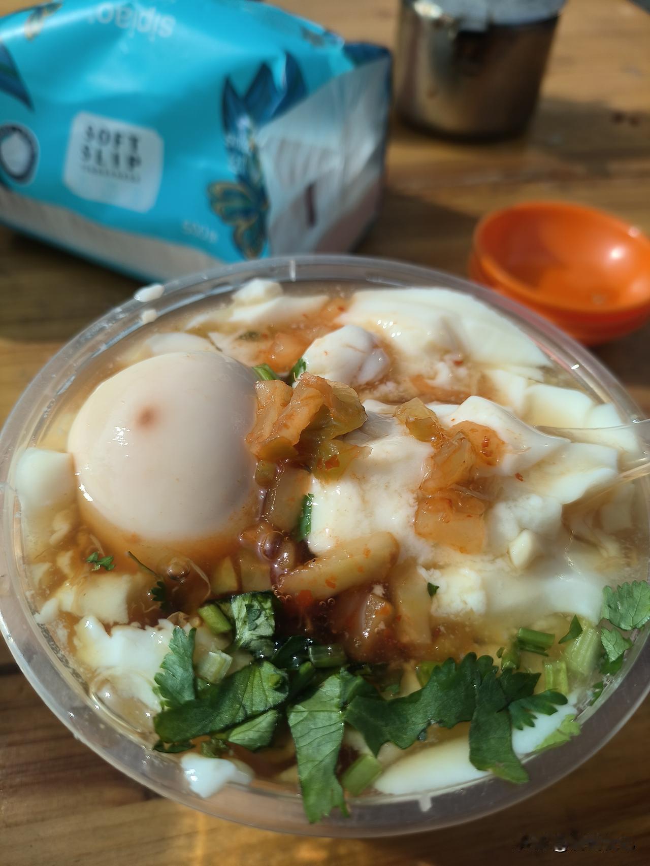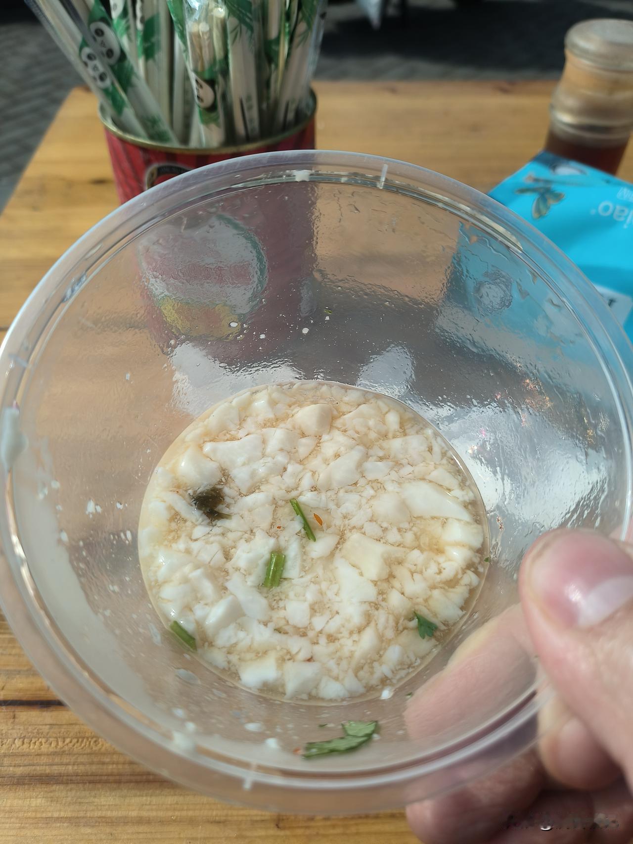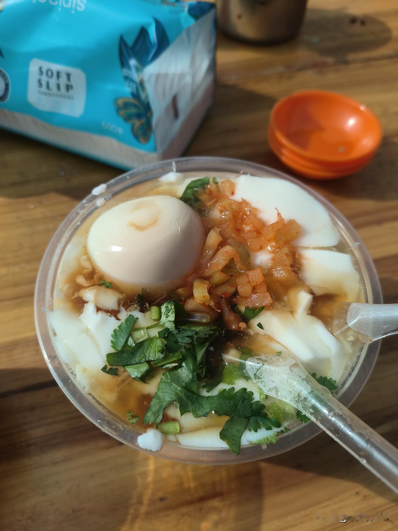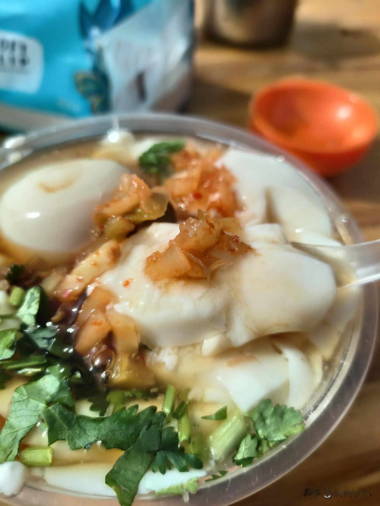 这个豆腐脑好在虽然有卤汁,但是没有别的含油成分。比如辣椒油,葱油或者油炸花生,只有一点榨菜。很清淡。