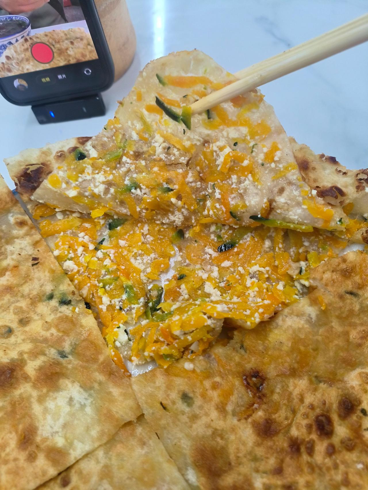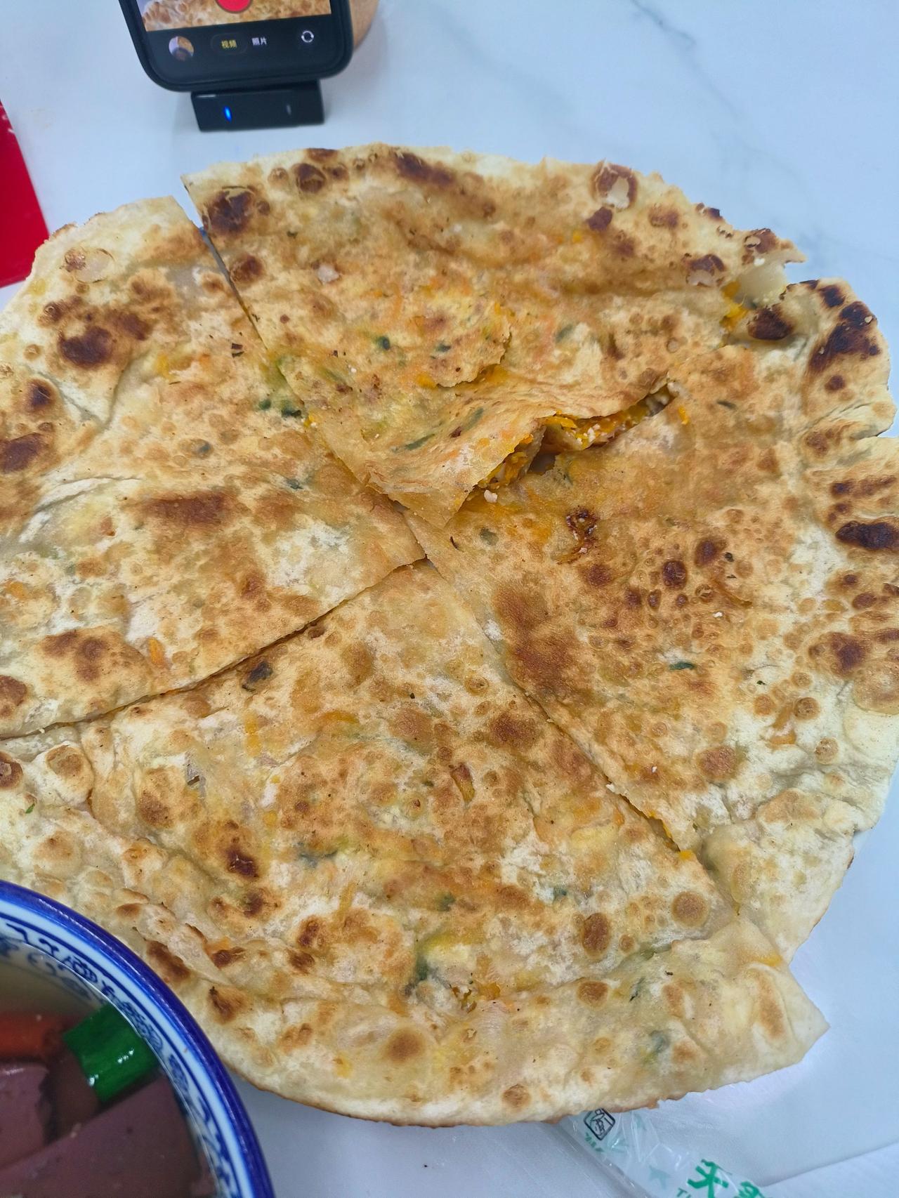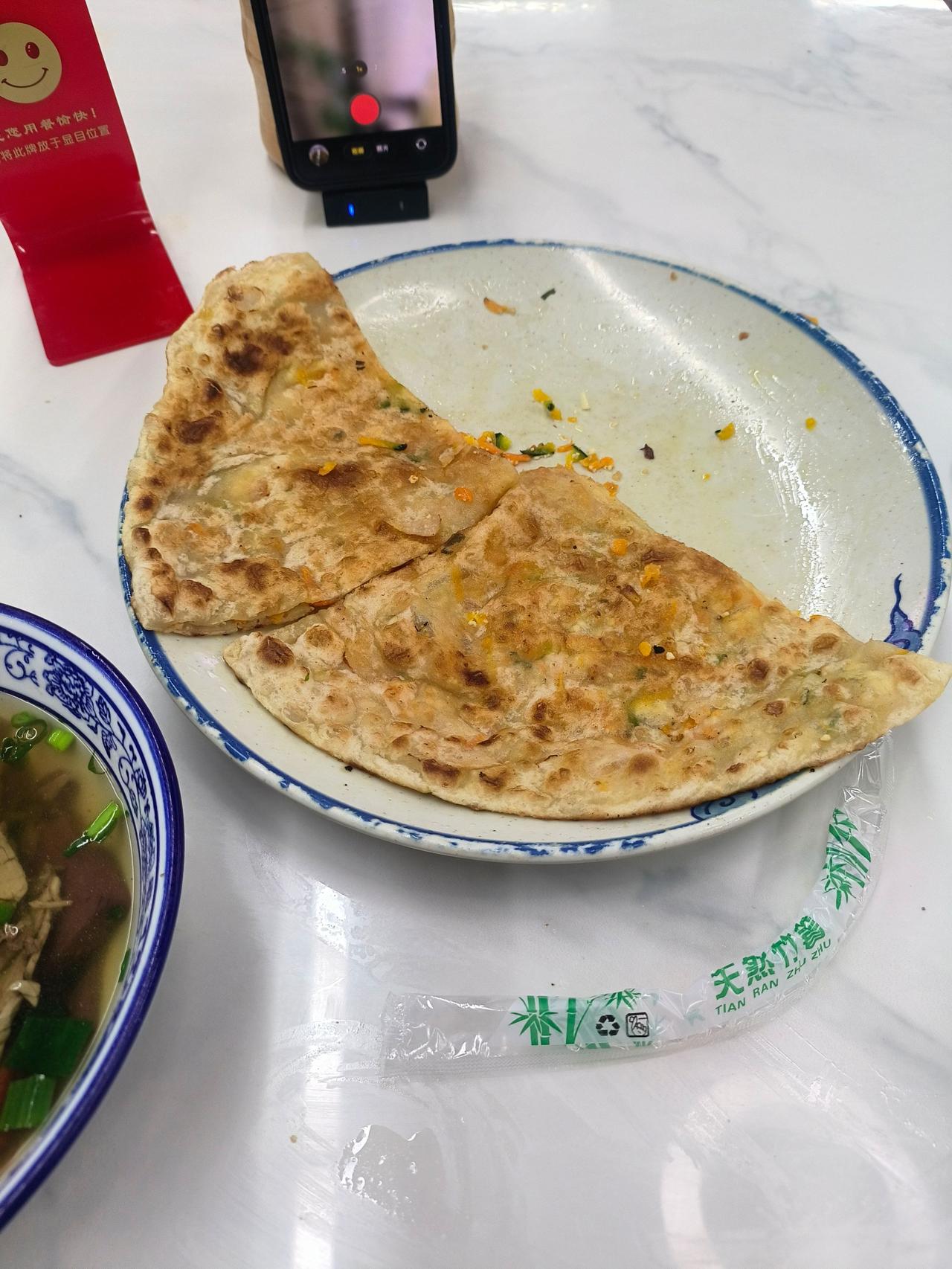 麦饼要的是南瓜豆腐馅的。饼皮用了很多油来煎麦饼要的是南瓜豆腐馅的,饼皮用了很多油来煎,很香,而且脆脆的。是好处,坏处是吃到最后稍微有一点腻,抹了一点辣椒酱吃就没问题了。为家乡美食打call 地方特色美食 牛清汤 牛肉汤 浦江
