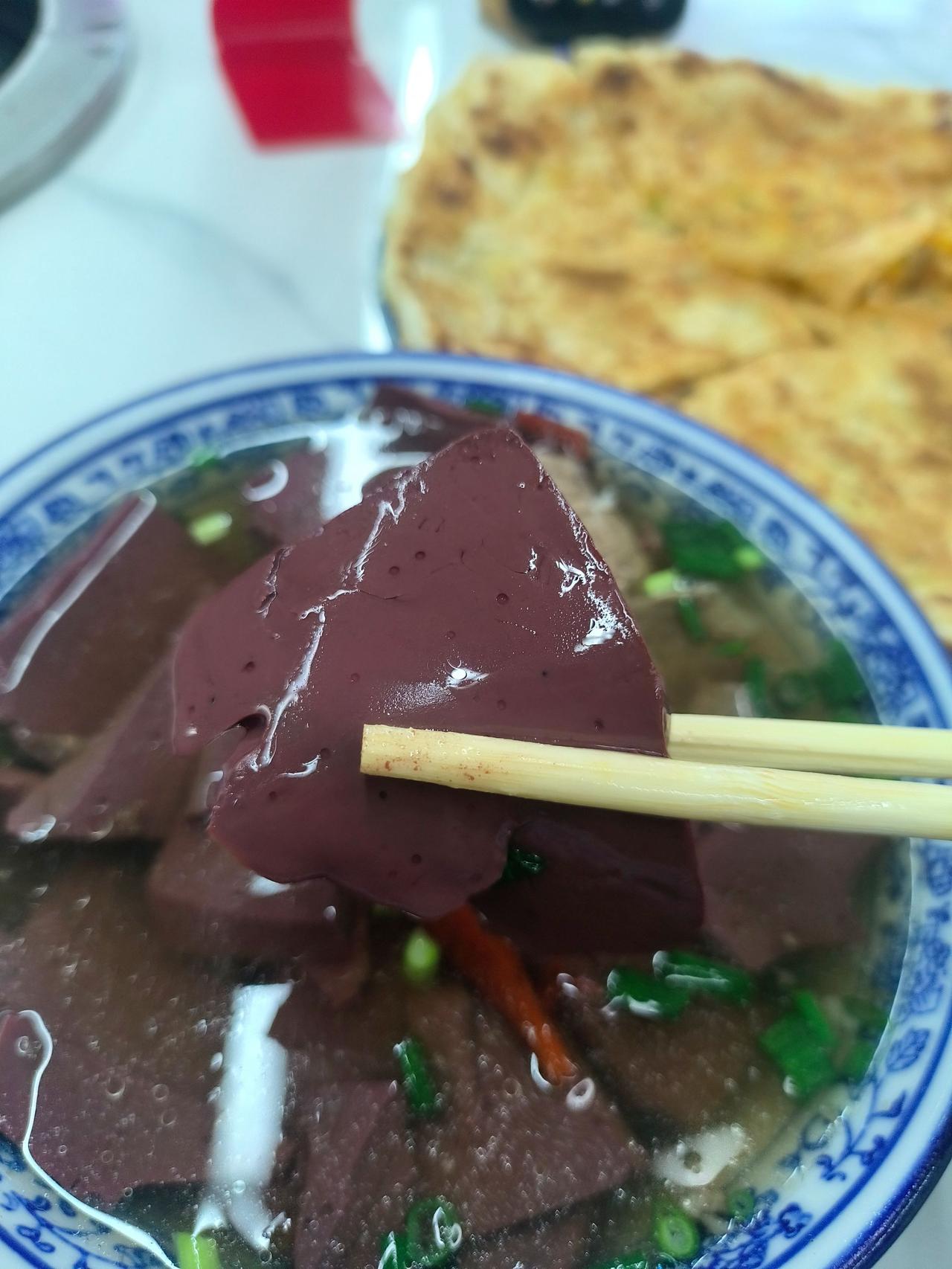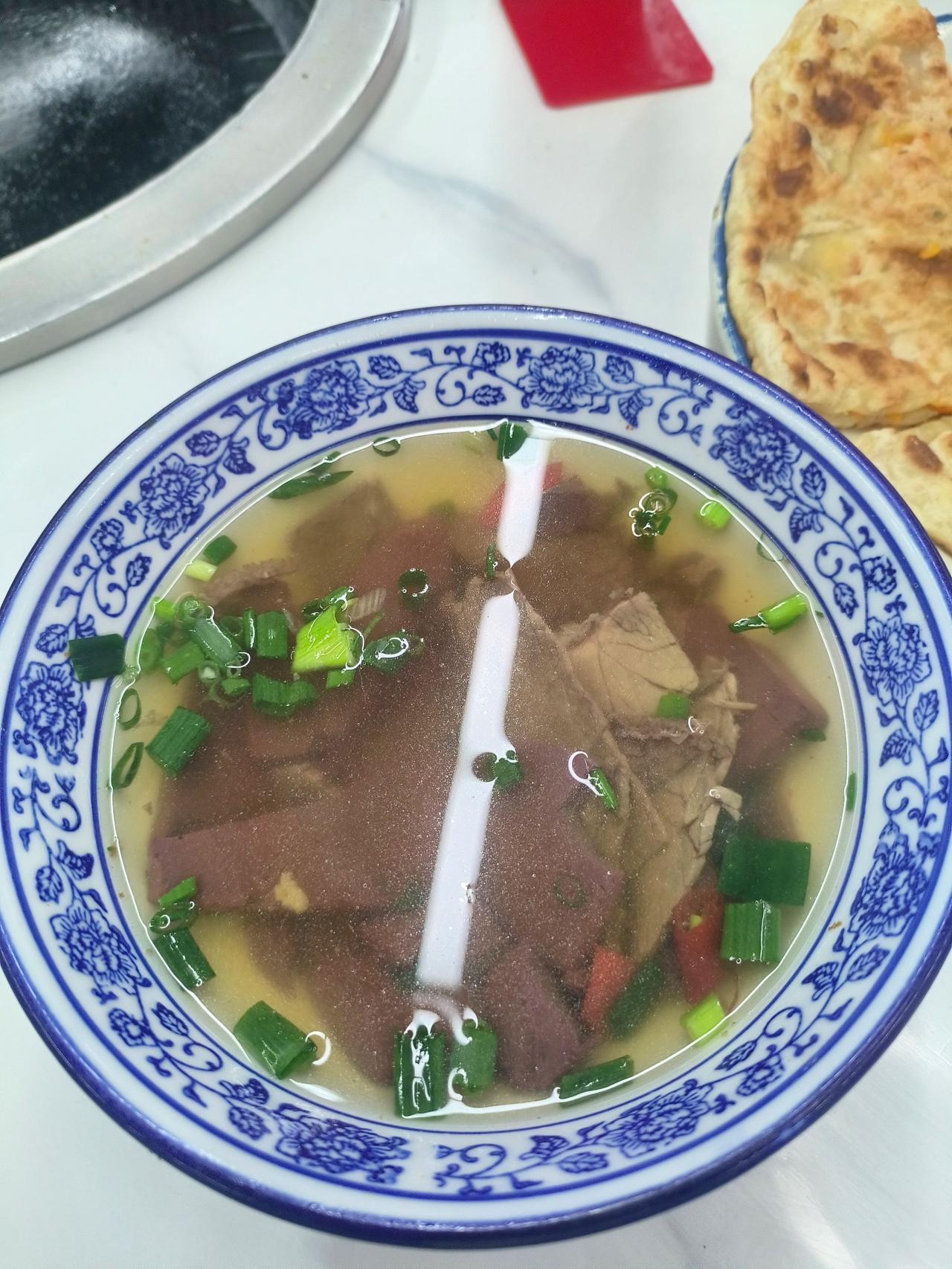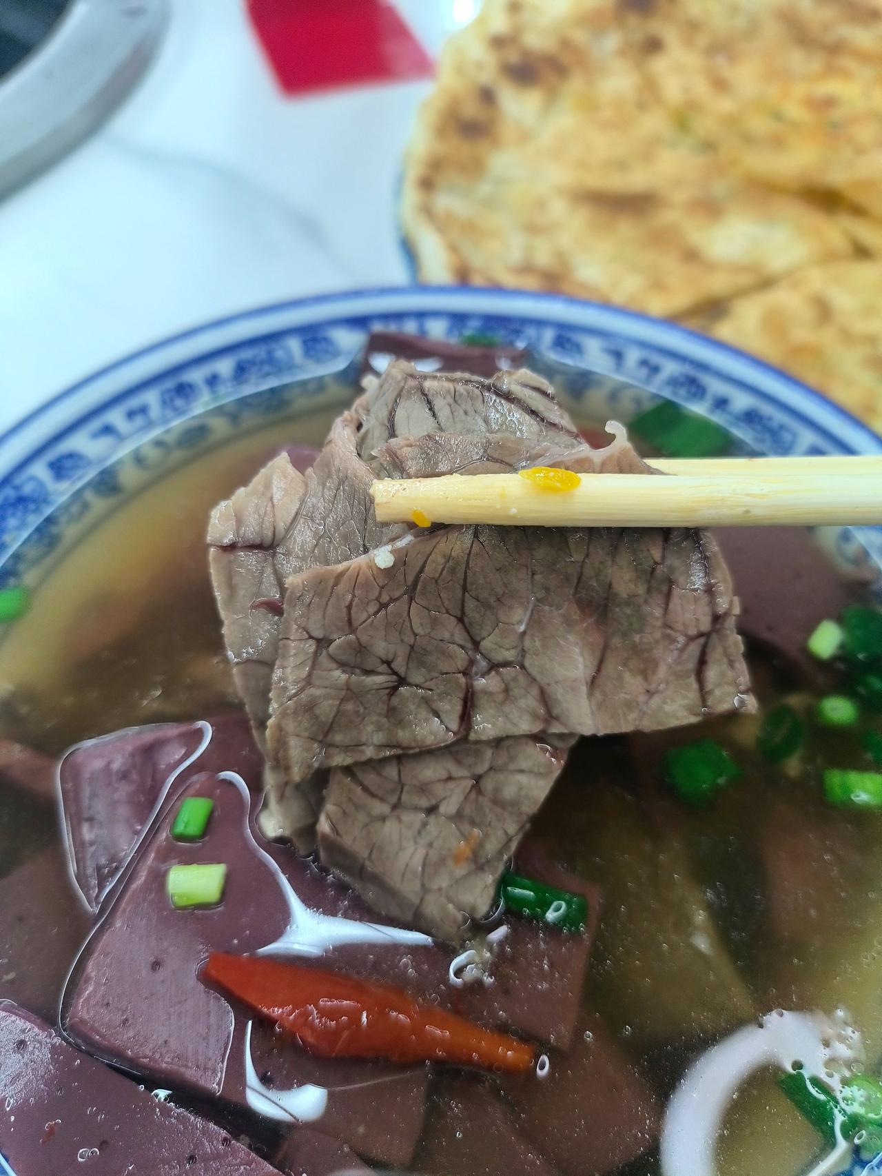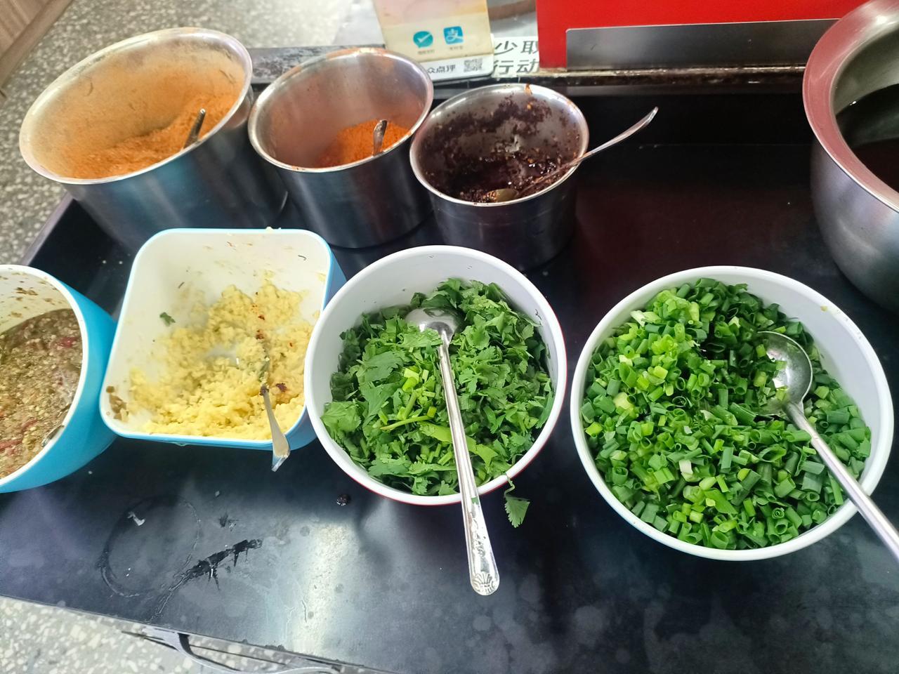 碗不大,但是内容比较丰富,牛血,还有牛肉,自己加了一点葱花。汤味是咸鲜,微辣,回口有一点酸。我不确定这个酸是出自哪里,因为明显他这个肉像是排酸过的,难道是辣椒的酸味?辣椒是发酵过的吗?总之味道还不错,就是味精,鸡精味稍微有一点重,别的没什么毛病。