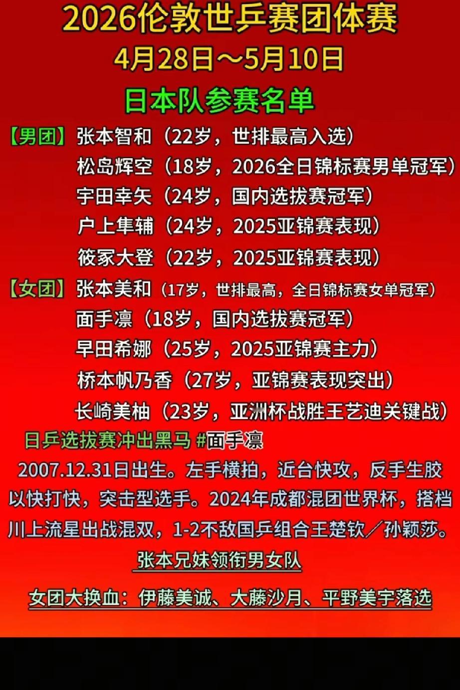 国乒目前确定的人有王楚钦 林诗栋 周启豪 向鹏 还有一个人还没有确定,假如樊振东不参赛的话,另外一人将看澳门世界杯参赛人员的成绩选拔,要是樊振东参赛的话就再好不过了。日本队参赛的选手有张本智和 松岛辉空 户上隼辅 宇田幸失